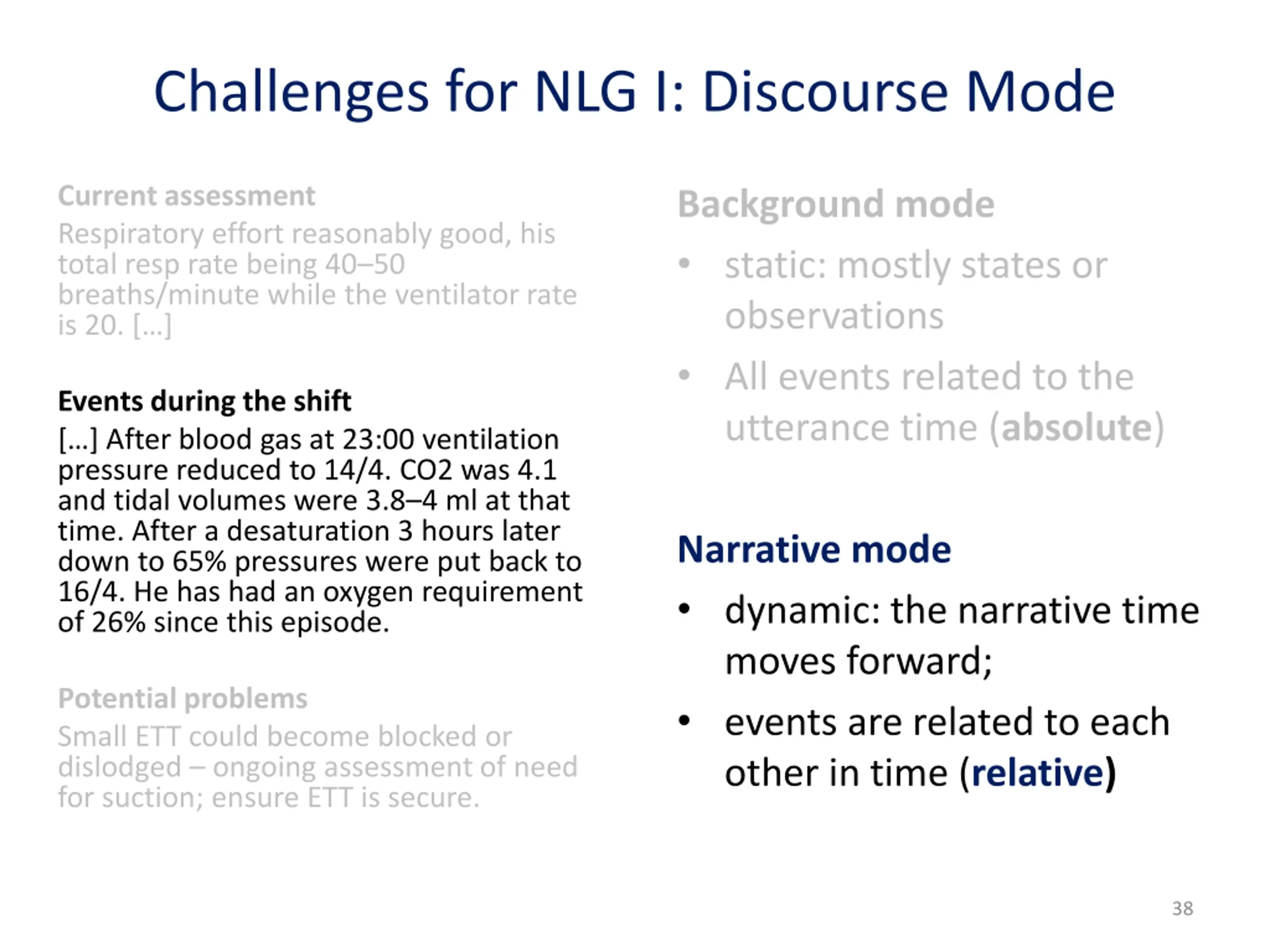 Challenges for NLG I: Discourse Mode Current assessment Respiratory effort reasonably good, his total resp rate being 40 50 breaths/minute while the ventilator rate is 20. [ ] Background mode static: mostly states or observations All events related to the utterance time (absolute) Events during the shift [ ] After blood gas at 23:00 ventilation pressure reduced to 14/4. CO2 was 4.1 and tidal volumes were 3.8 4 ml at that time. After a desaturation 3 hours later down to 65% pressures were put back to 16/4. He has had an oxygen requirement of 26% since this episode. Potential problems Small ETT could become blocked or dislodged ongoing assessment of need for suction; ensure ETT is secure. 37