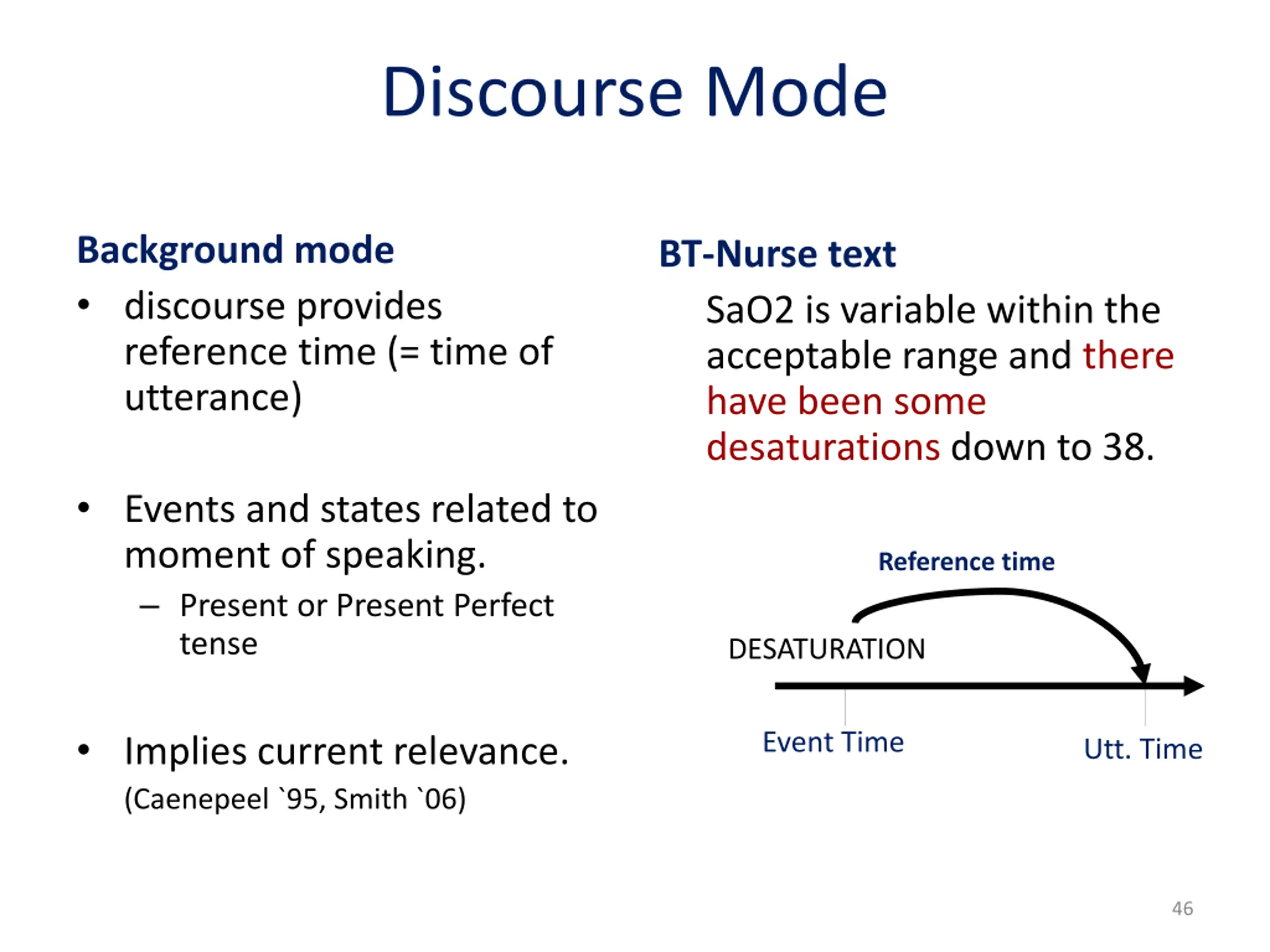 Discourse Mode Background mode discourse provides reference time (= time of utterance) BT-Nurse text SaO2 is variable within the acceptable range and there have been some desaturations down to 38. Events and states related to moment of speaking. Present or Present Perfect tense Reference time DESATURATION Implies current relevance. (Caenepeel `95, Smith `06) Event Time Utt. Time 46