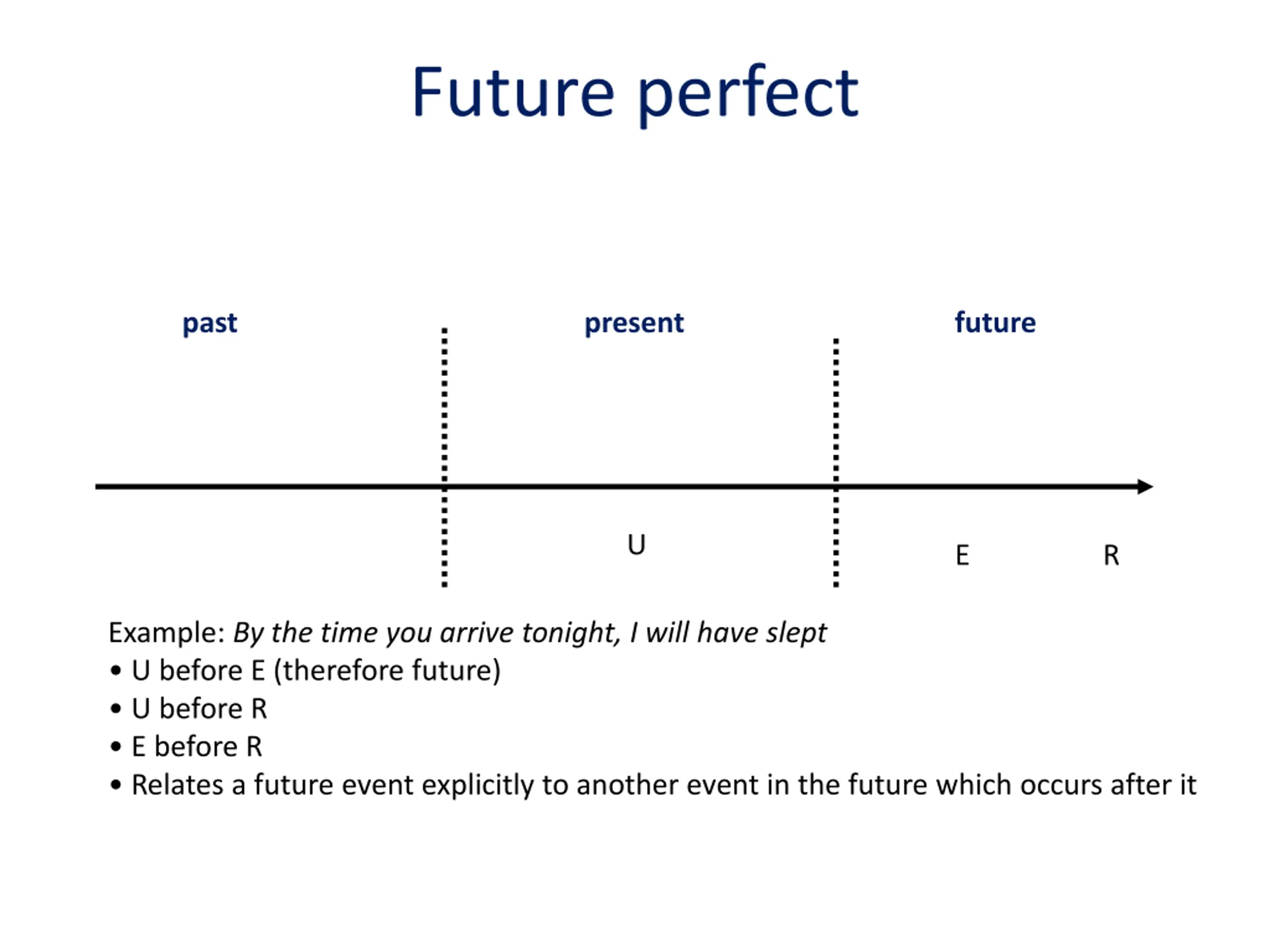 Future perfect past present future U E R Example: By the time you arrive tonight, I will have slept U before E (therefore future) U before R E before R Relates a future event explicitly to another event in the future which occurs after it