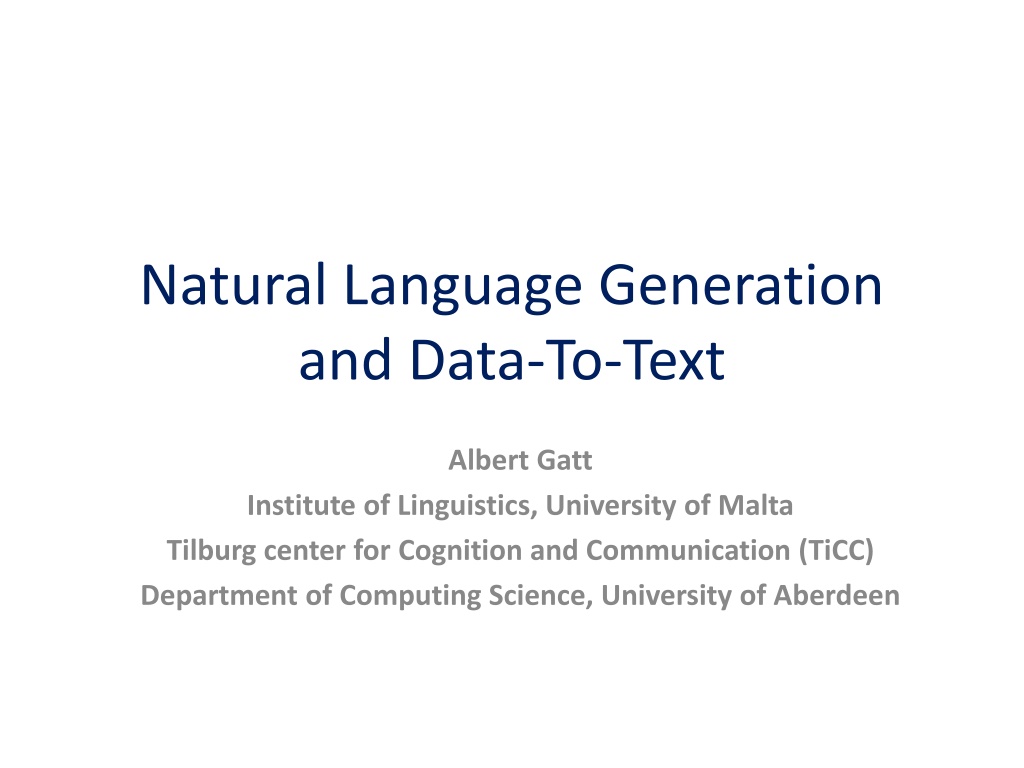 Natural Language Generation and Data-To-Text Albert Gatt Institute of Linguistics, University of Malta Tilburg center for Cognition and Communication (TiCC) Department of Computing Science, University of Aberdeen