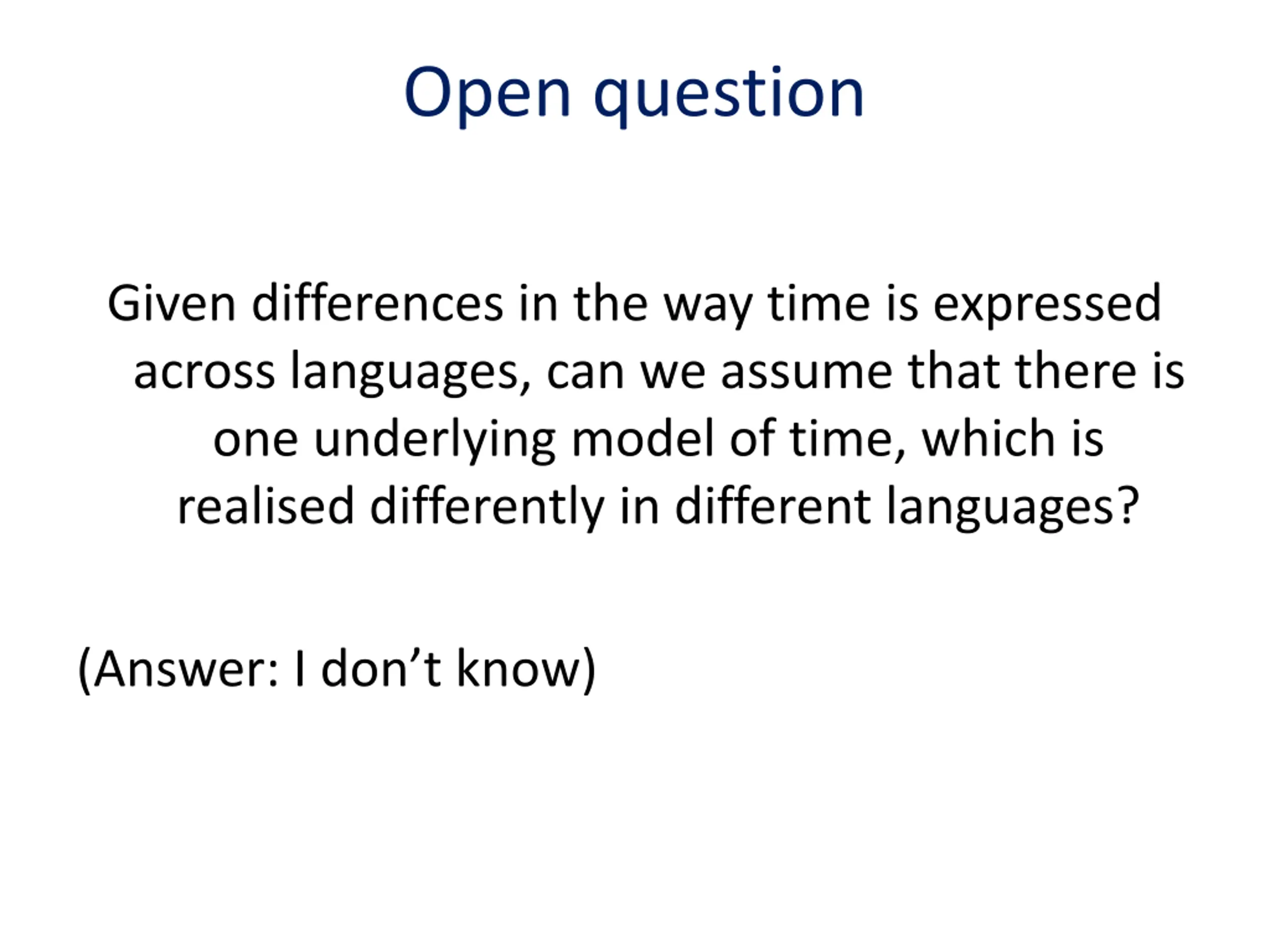 Open question Given differences in the way time is expressed across languages, can we assume that there is one underlying model of time, which is realised differently in different languages? (Answer: I don t know)