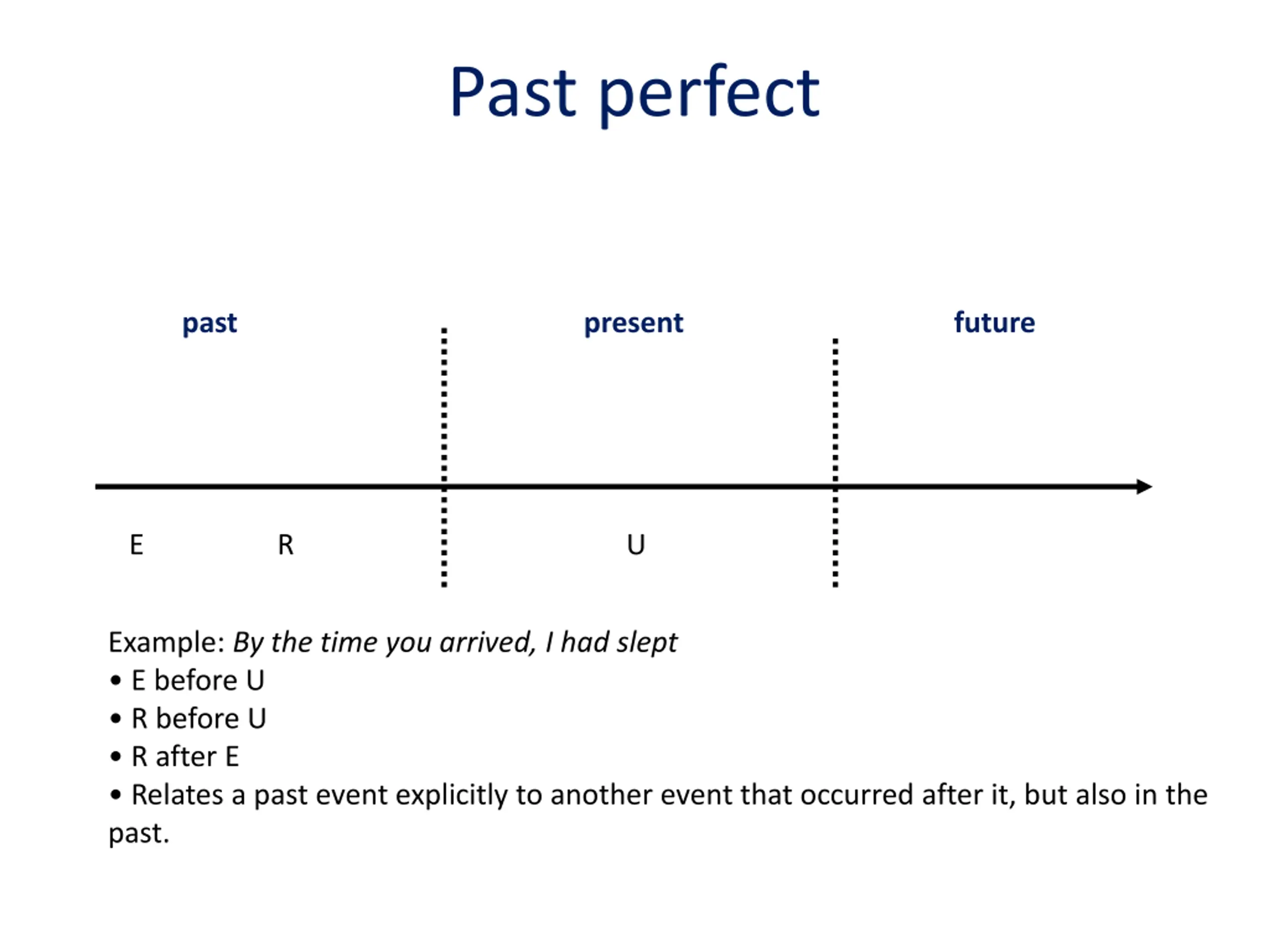 Past perfect past present future E R U Example: By the time you arrived, I had slept E before U R before U R after E Relates a past event explicitly to another event that occurred after it, but also in the past.