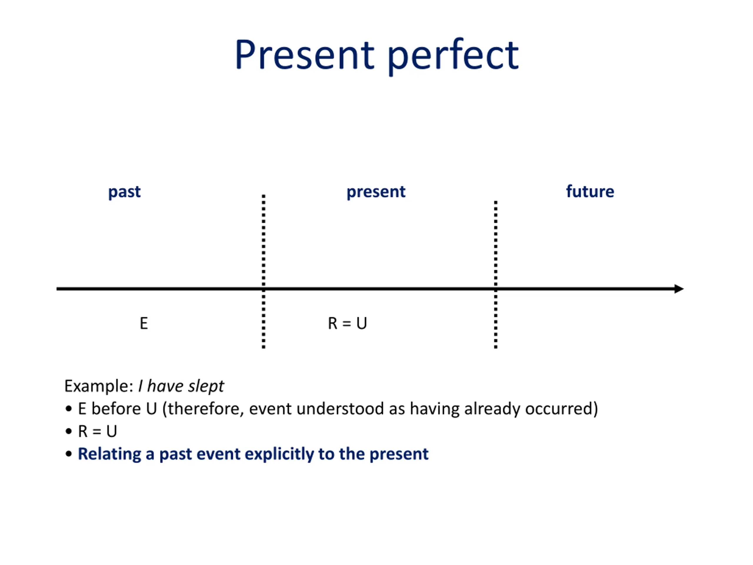 Present perfect past present future E R = U Example: I have slept E before U (therefore, event understood as having already occurred) R = U Relating a past event explicitly to the present