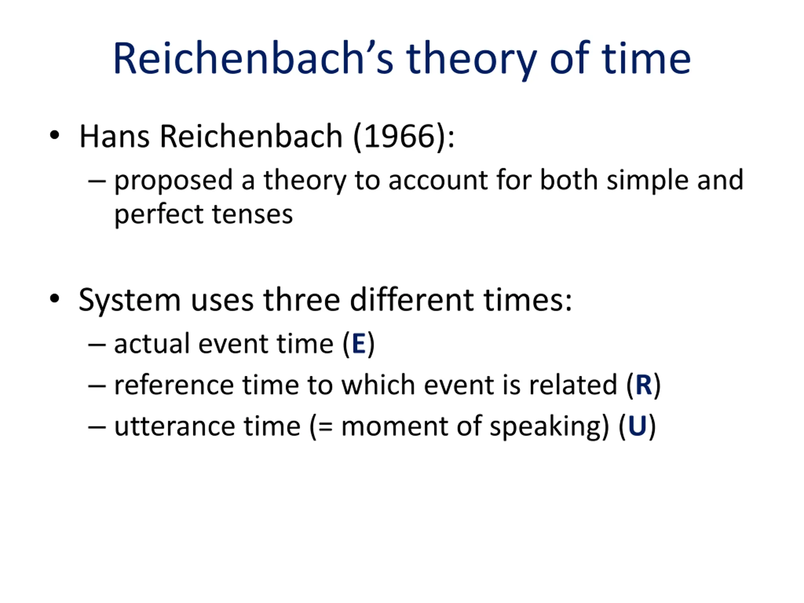 Reichenbachs theory of time Hans Reichenbach (1966): proposed a theory to account for both simple and perfect tenses System uses three different times: actual event time (E) reference time to which event is related (R) utterance time (= moment of speaking) (U)
