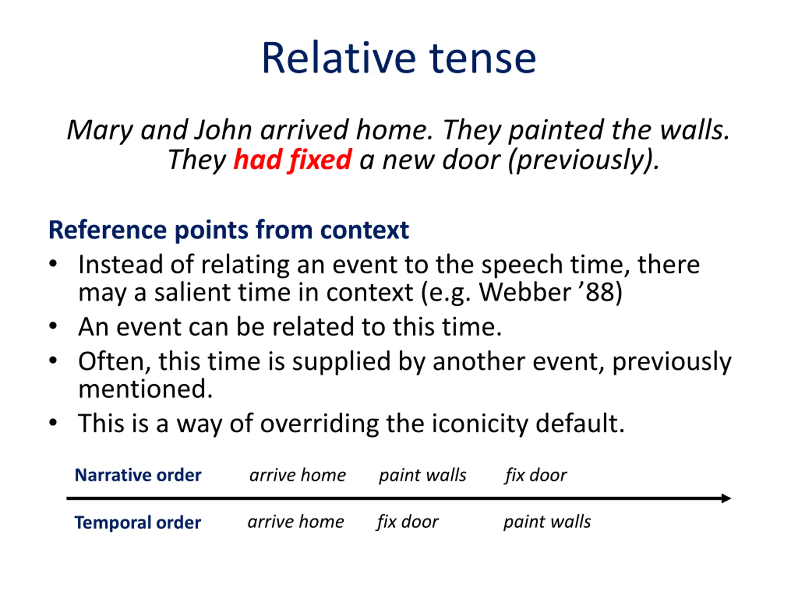 Relative tense Mary and John arrived home. They painted the walls. They had fixed a new door (previously). Reference points from context Instead of relating an event to the speech time, there may a salient time in context (e.g. Webber 88) An event can be related to this time. Often, this time is supplied by another event, previously mentioned. This is a way of overriding the iconicity default. Narrative order arrive home paint walls fix door arrive home fix door paint walls Temporal order