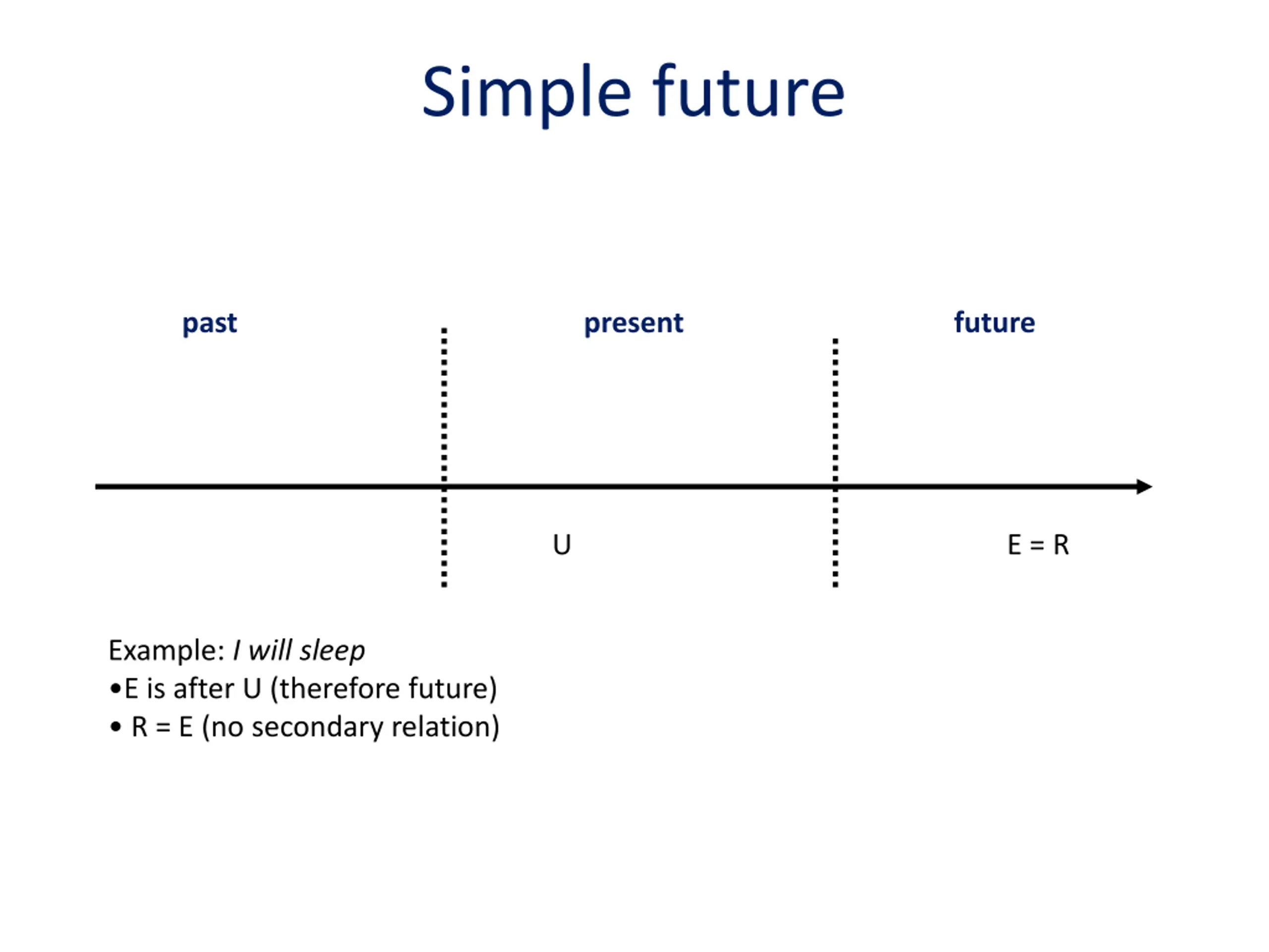 Simple future past present future U E = R Example: I will sleep E is after U (therefore future) R = E (no secondary relation)