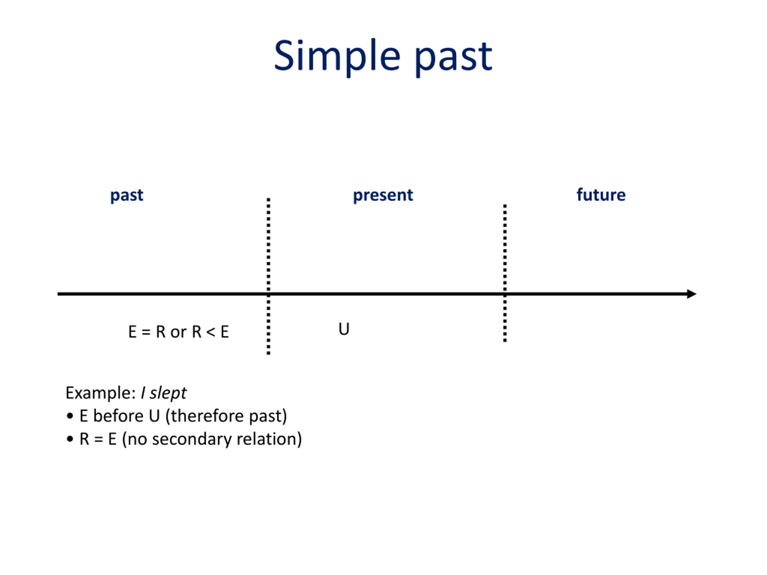 Simple past past present future U E = R or R < E Example: I slept E before U (therefore past) R = E (no secondary relation)