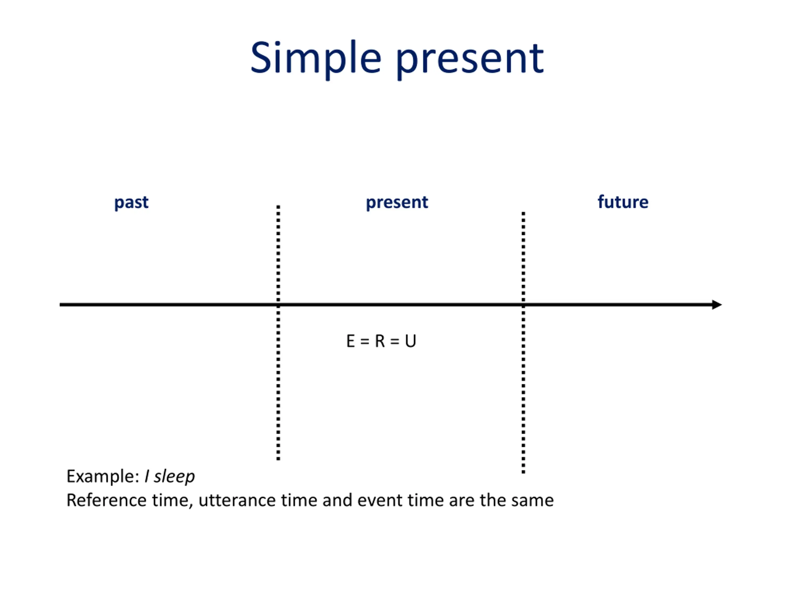 Simple present past present future E = R = U Example: I sleep Reference time, utterance time and event time are the same