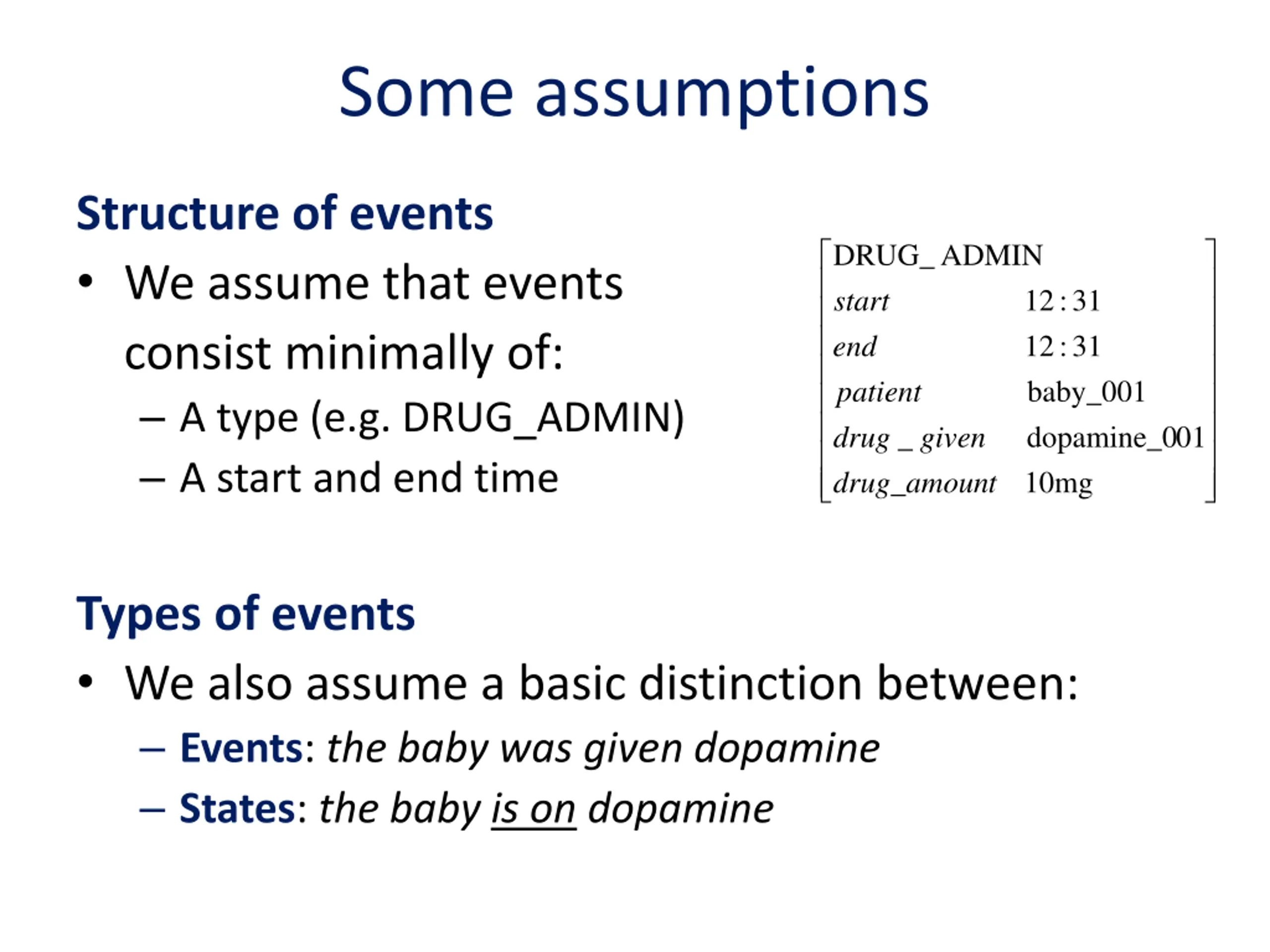 Some assumptions Structure of events We assume that events consist minimally of: A type (e.g. DRUG_ADMIN) A start and end time DRUG start _ ADMIN 12 : 31 12 : 31 end baby_001 patient _ dopamine_0 01 drug given 10mg drug_amoun t Types of events We also assume a basic distinction between: Events: the baby was given dopamine States: the baby is on dopamine