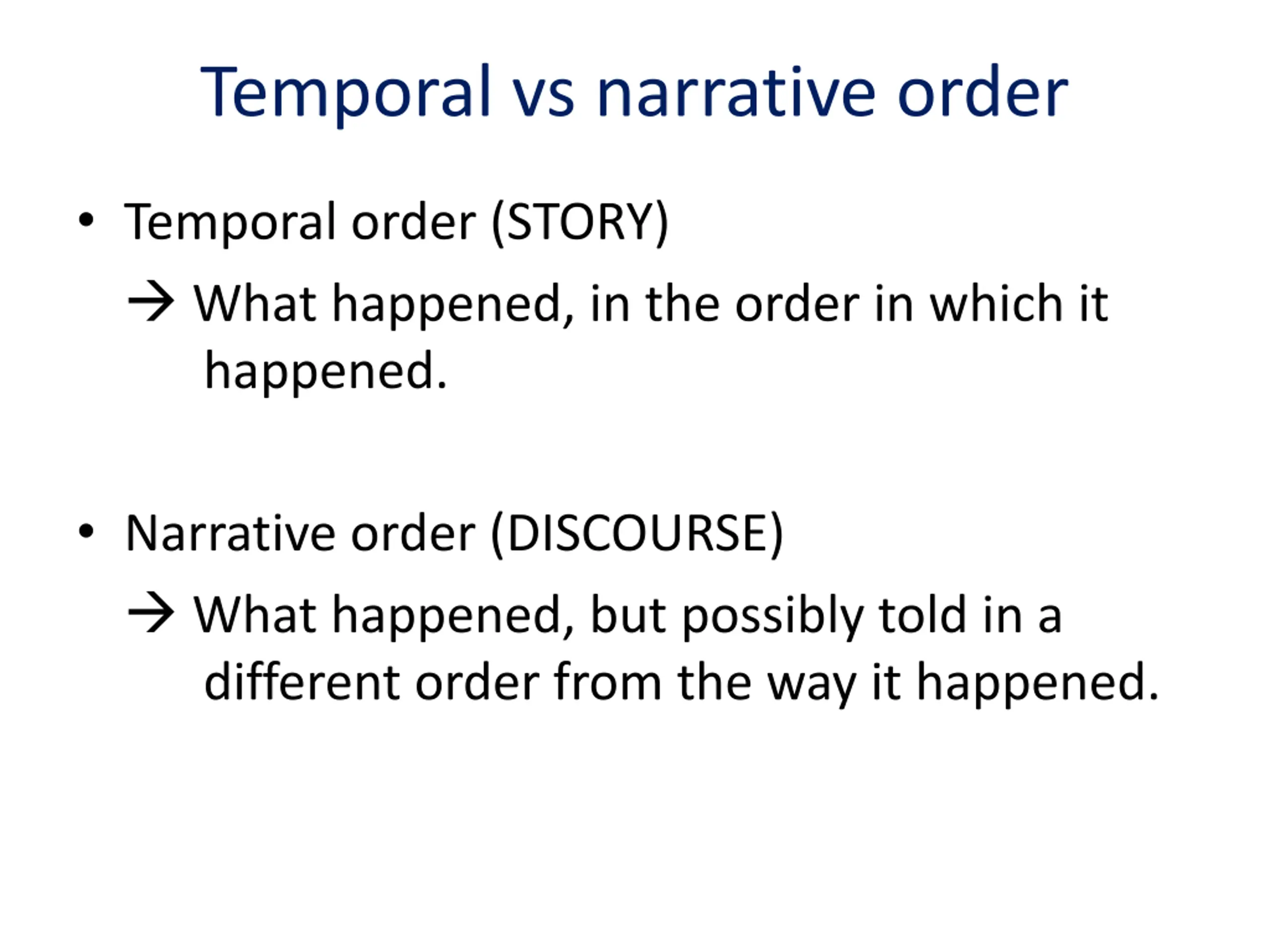 Temporal vs narrative order Temporal order (STORY) What happened, in the order in which it happened. Narrative order (DISCOURSE) What happened, but possibly told in a different order from the way it happened.