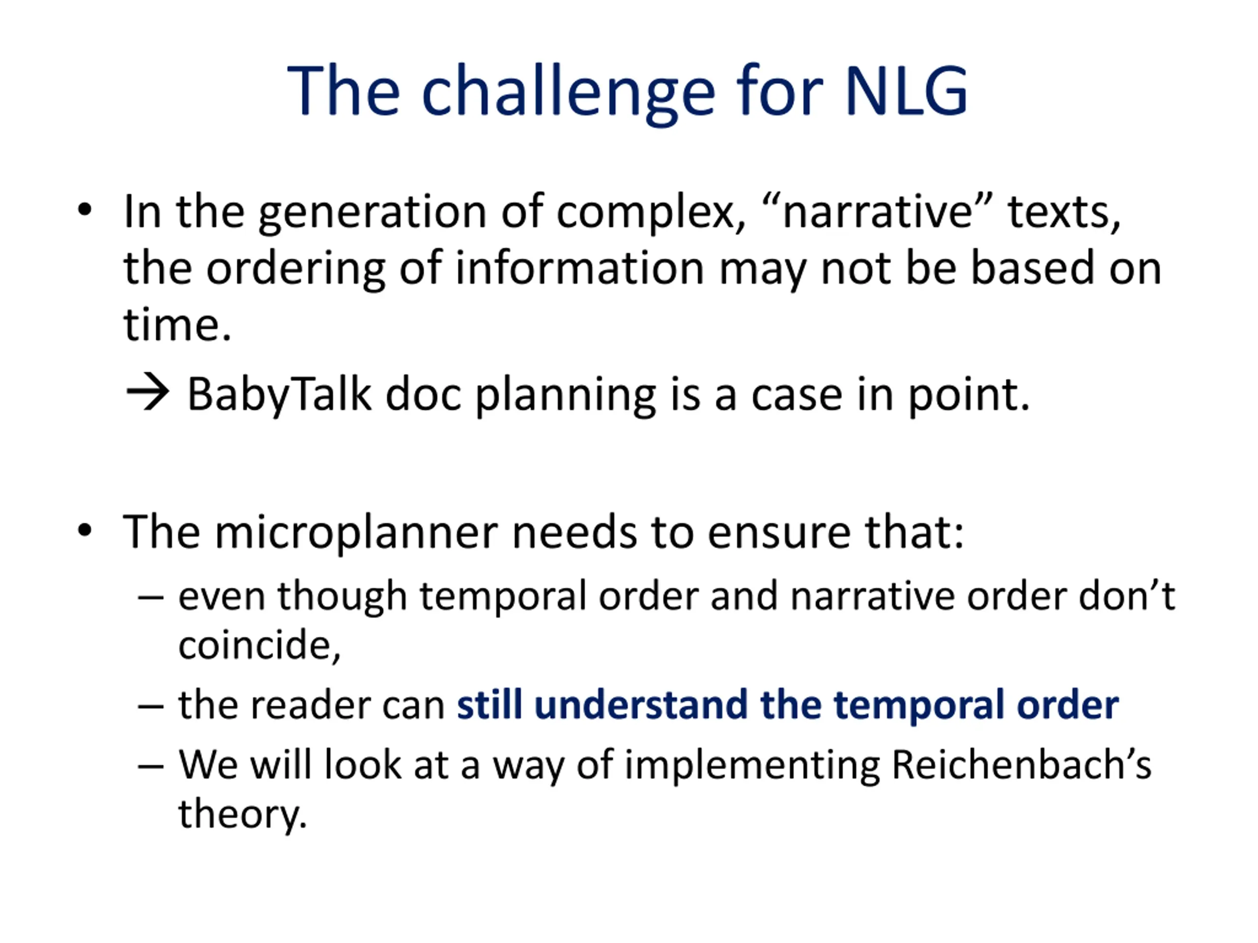 The challenge for NLG In the generation of complex, narrative texts, the ordering of information may not be based on time. BabyTalk doc planning is a case in point. The microplanner needs to ensure that: even though temporal order and narrative order don t coincide, the reader can still understand the temporal order We will look at a way of implementing Reichenbach s theory.