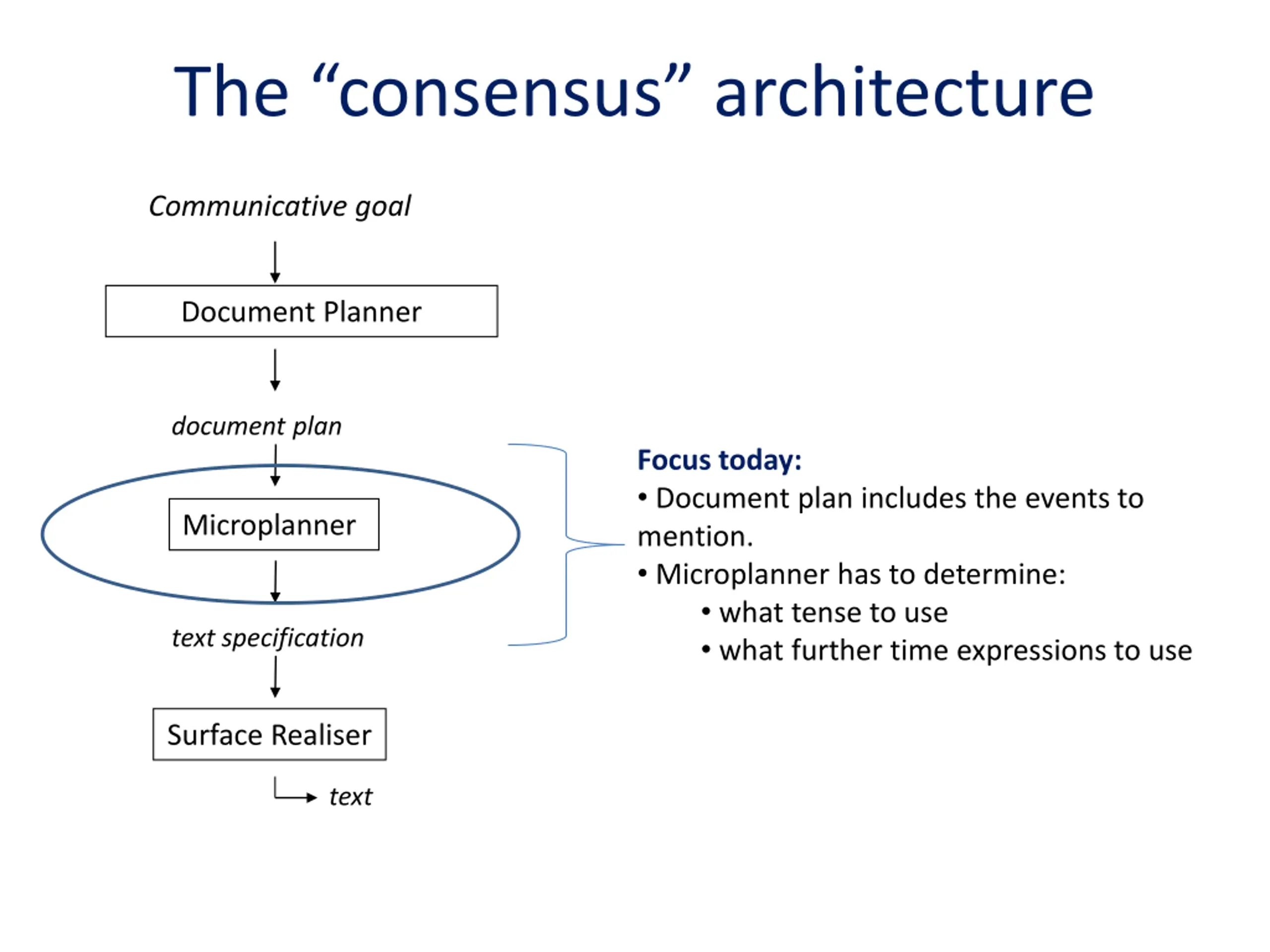 The consensus architecture Communicative goal Document Planner document plan Focus today: Document plan includes the events to mention. Microplanner has to determine: what tense to use what further time expressions to use Microplanner text specification Surface Realiser text