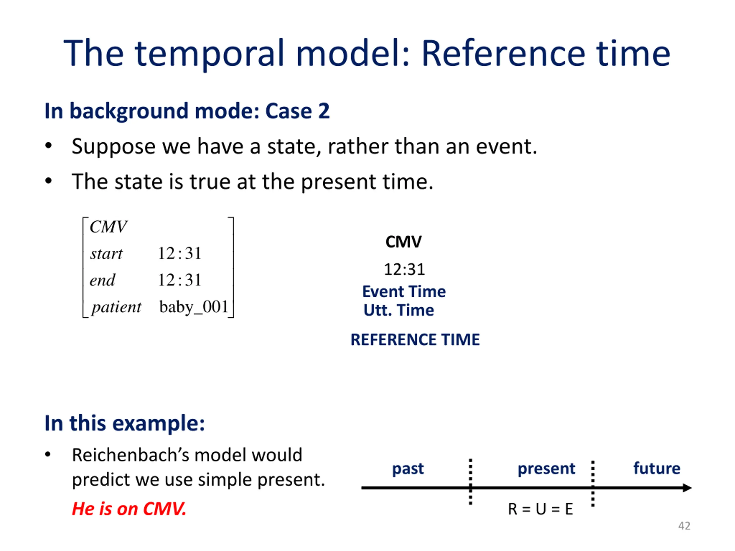 The temporal model: Reference time In background mode: Case 2 Suppose we have a state, rather than an event. The state is true at the present time. CMV CMV 12 : 31 start 12:31 12 : 31 end Event Time Utt. Time baby_001 patient REFERENCE TIME In this example: Reichenbach s model would predict we use simple present. He is on CMV. past present future R = U = E 42