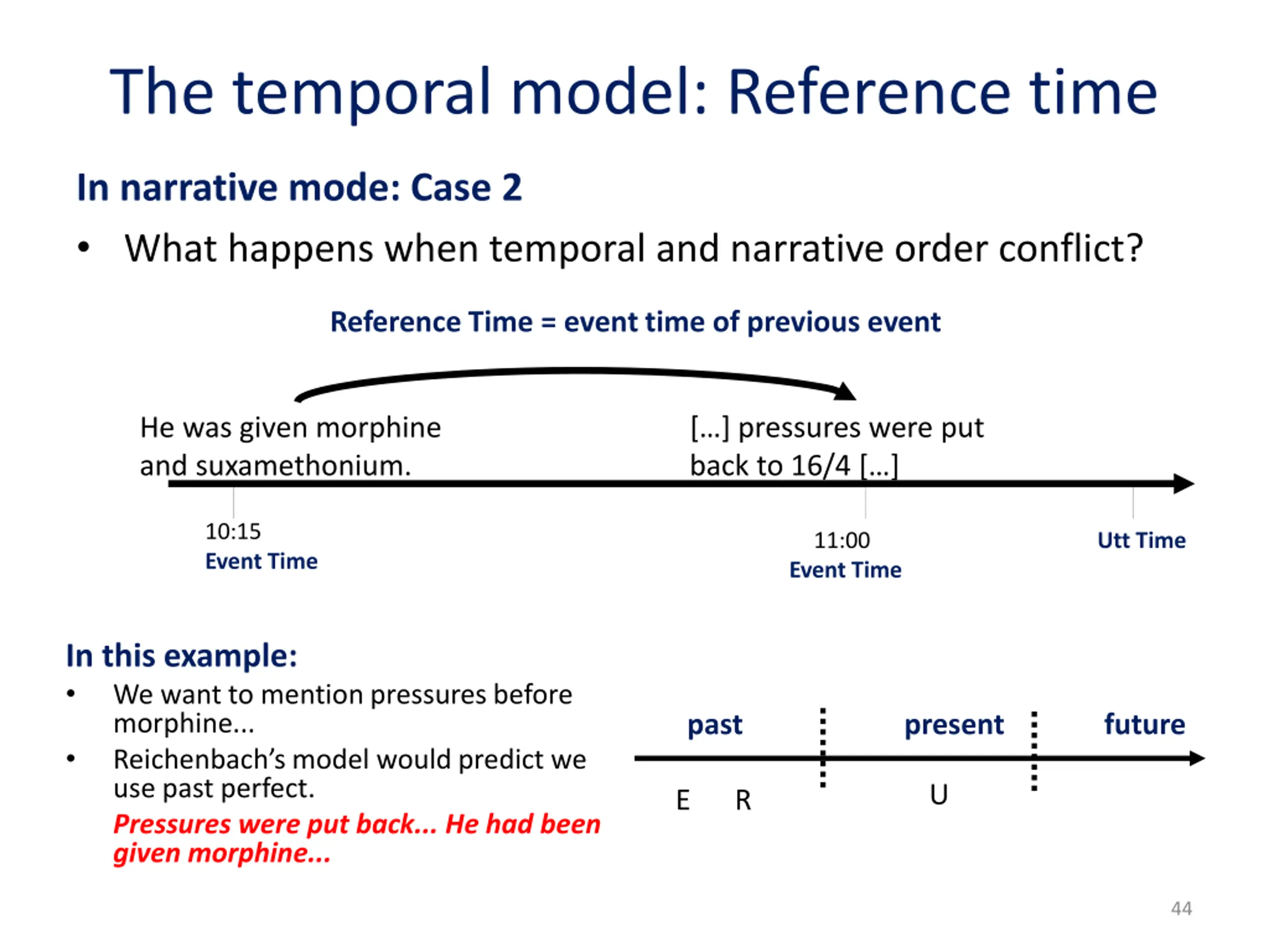 The temporal model: Reference time In narrative mode: Case 1 Here, events are not related to the present, but to each other. Reference Time = event time of previous event [ ] pressures were put back to 16/4 [ ] He was given morphine and suxamethonium. 10:15 Event Time 11:00 Event Time Utt Time In this example: Reichenbach s model would predict we use simple past. He was given morphine... past present future U R < E 43