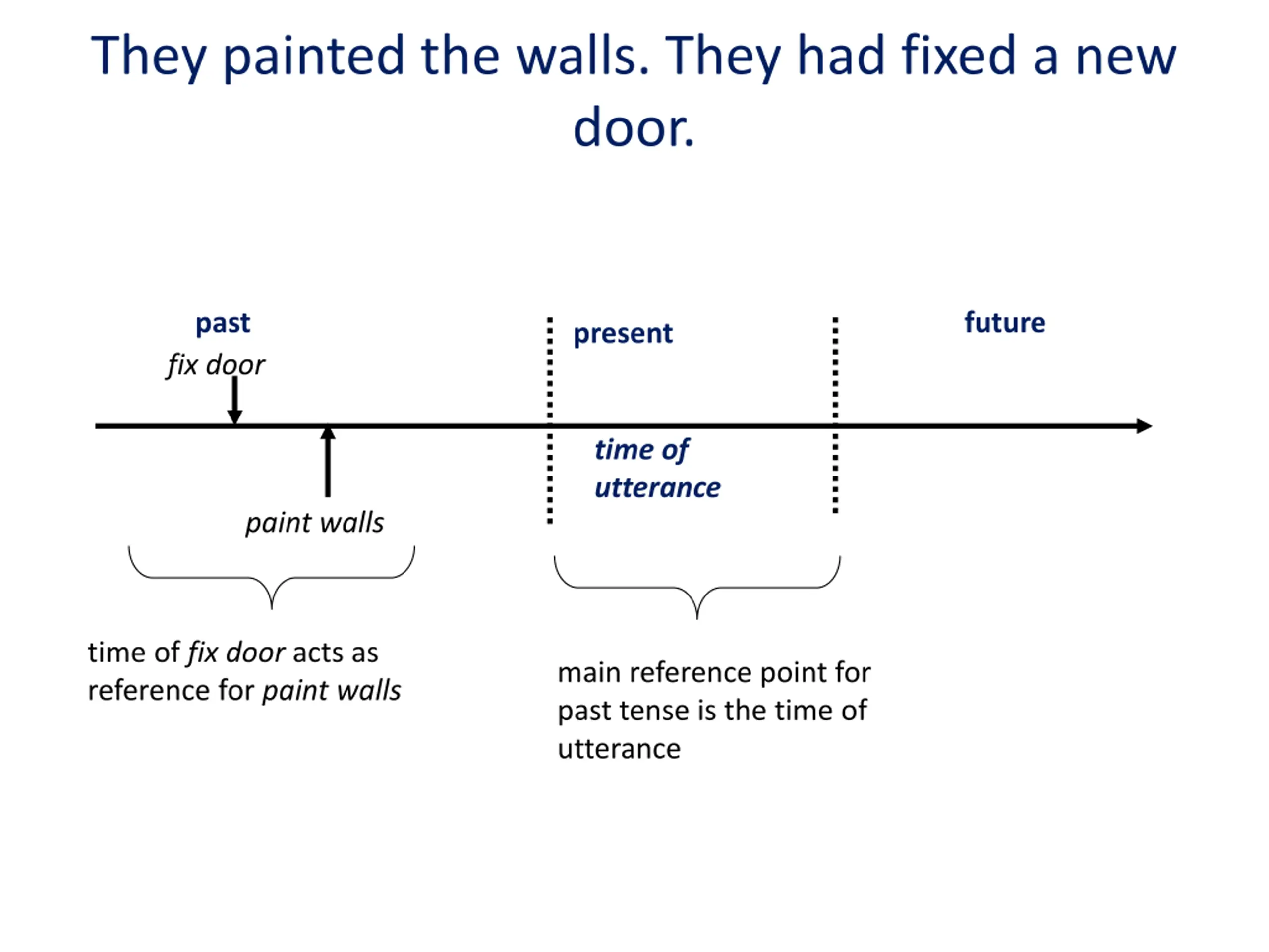 They painted the walls. They had fixed a new door. past fix door future present time of utterance paint walls time of fix door acts as reference for paint walls main reference point for past tense is the time of utterance