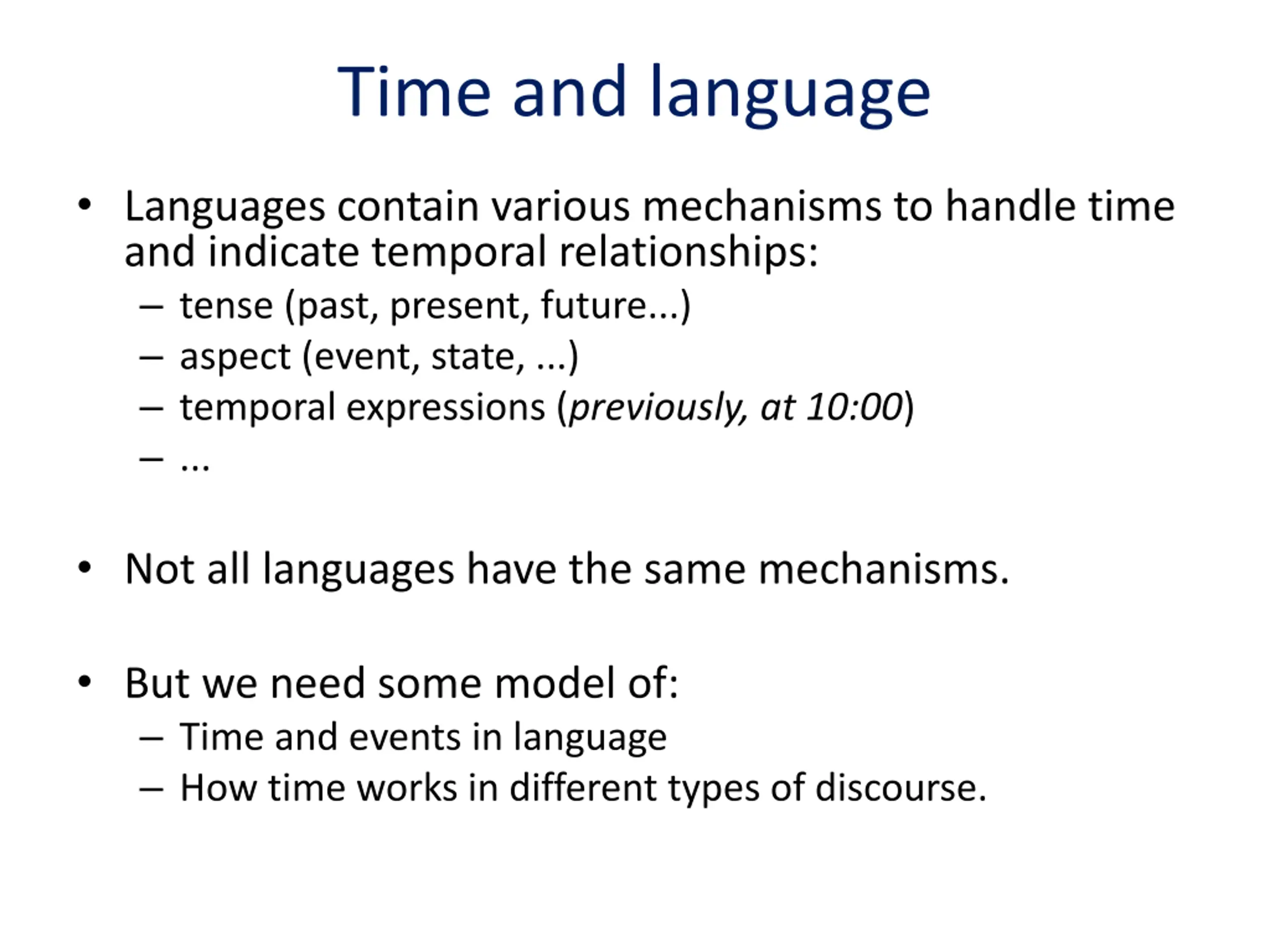 Time and language Languages contain various mechanisms to handle time and indicate temporal relationships: tense (past, present, future...) aspect (event, state, ...) temporal expressions (previously, at 10:00) ... Not all languages have the same mechanisms. But we need some model of: Time and events in language How time works in different types of discourse.