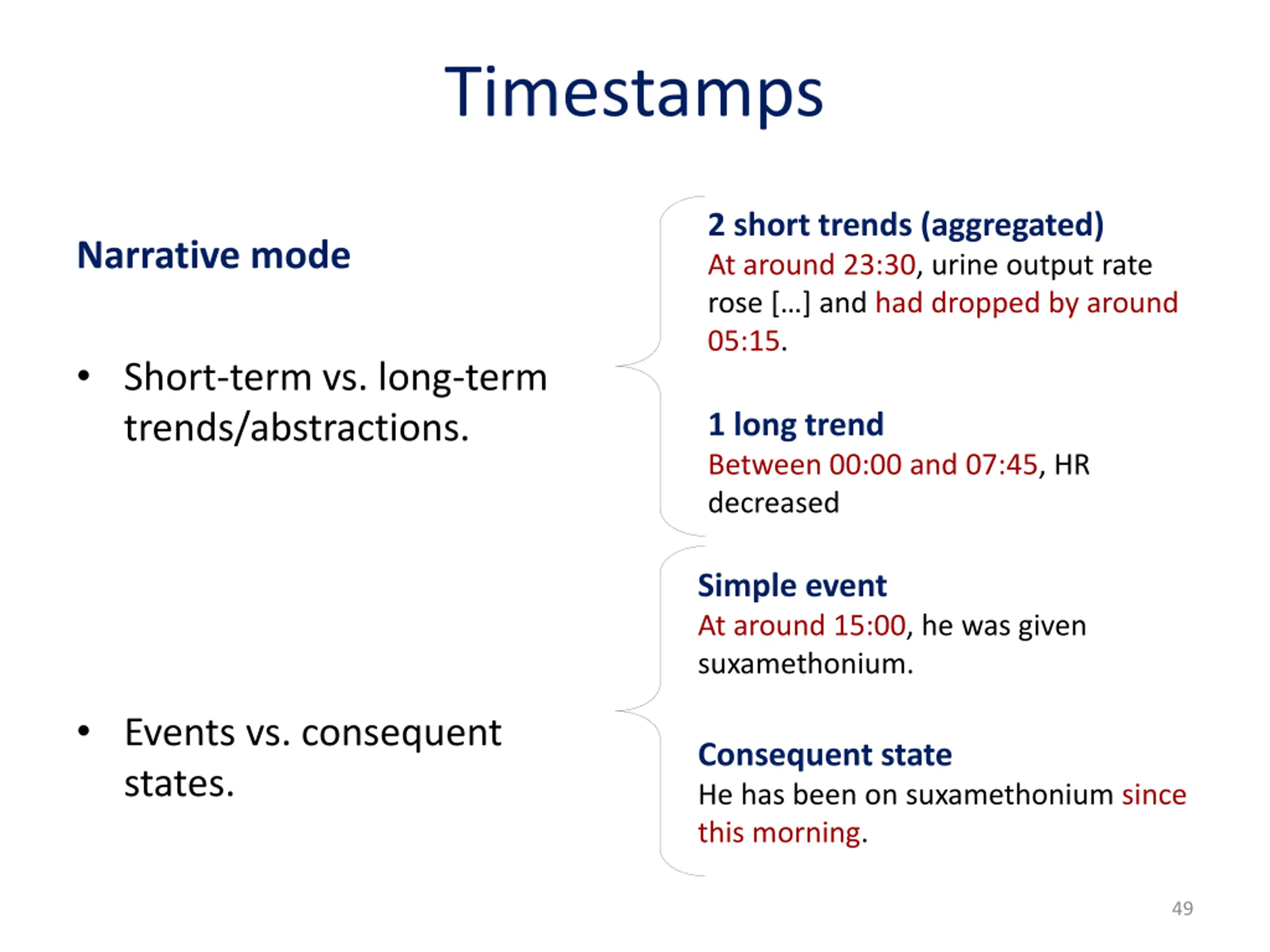 Timestamps 2 short trends (aggregated) At around 23:30, urine output rate rose [ ] and had dropped by around 05:15. Narrative mode Short-term vs. long-term trends/abstractions. 1 long trend Between 00:00 and 07:45, HR decreased Simple event At around 15:00, he was given suxamethonium. Events vs. consequent states. Consequent state He has been on suxamethonium since this morning. 49