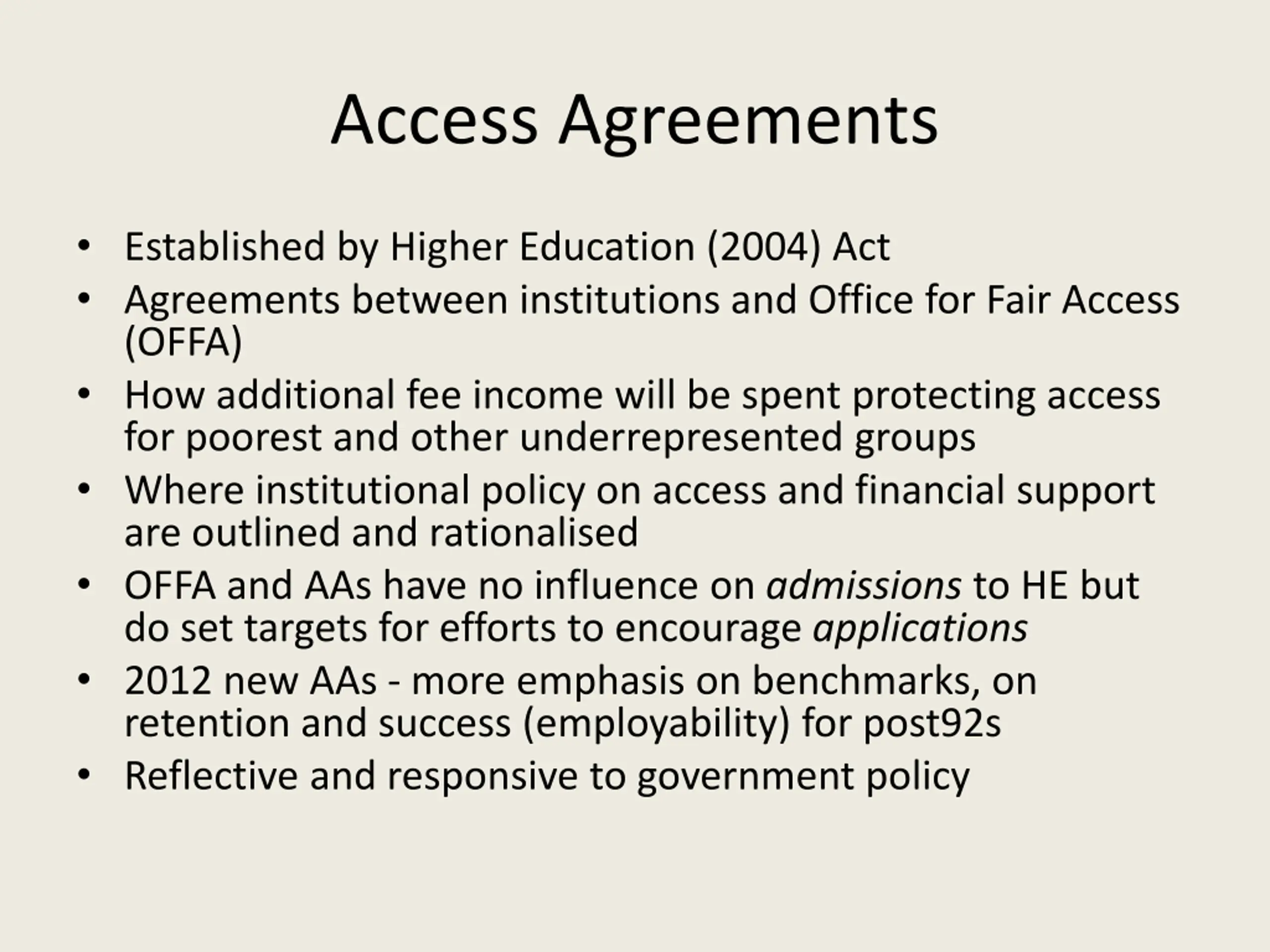 Access Agreements Established by Higher Education (2004) Act Agreements between institutions and Office for Fair Access (OFFA) How additional fee income will be spent protecting access for poorest and other underrepresented groups Where institutional policy on access and financial support are outlined and rationalised OFFA and AAs have no influence on admissions to HE but do set targets for efforts to encourage applications 2012 new AAs - more emphasis on benchmarks, on retention and success (employability) for post92s Reflective and responsive to government policy