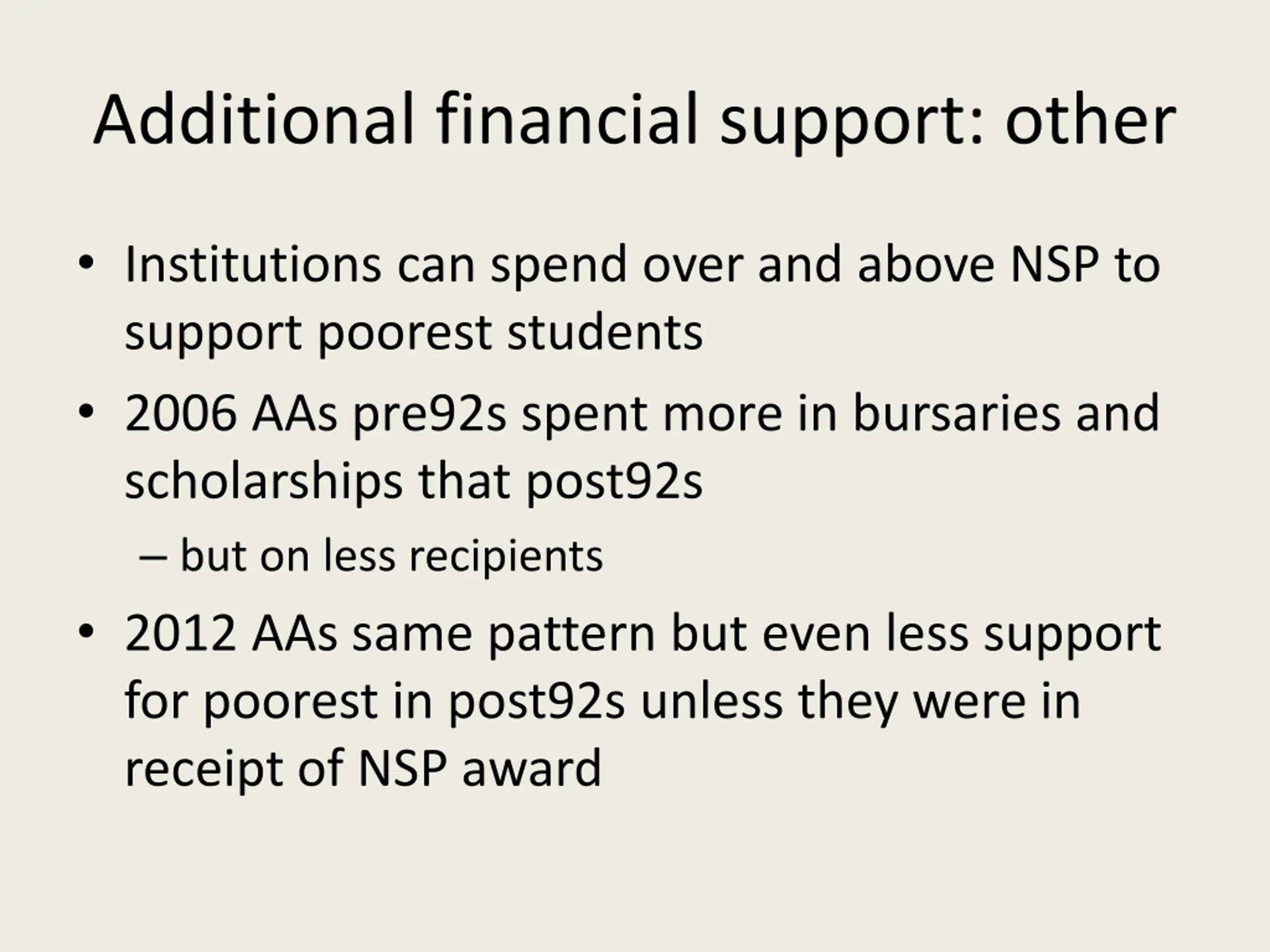 Additional financial support: other Institutions can spend over and above NSP to support poorest students 2006 AAs pre92s spent more in bursaries and scholarships that post92s but on less recipients 2012 AAs same pattern but even less support for poorest in post92s unless they were in receipt of NSP award