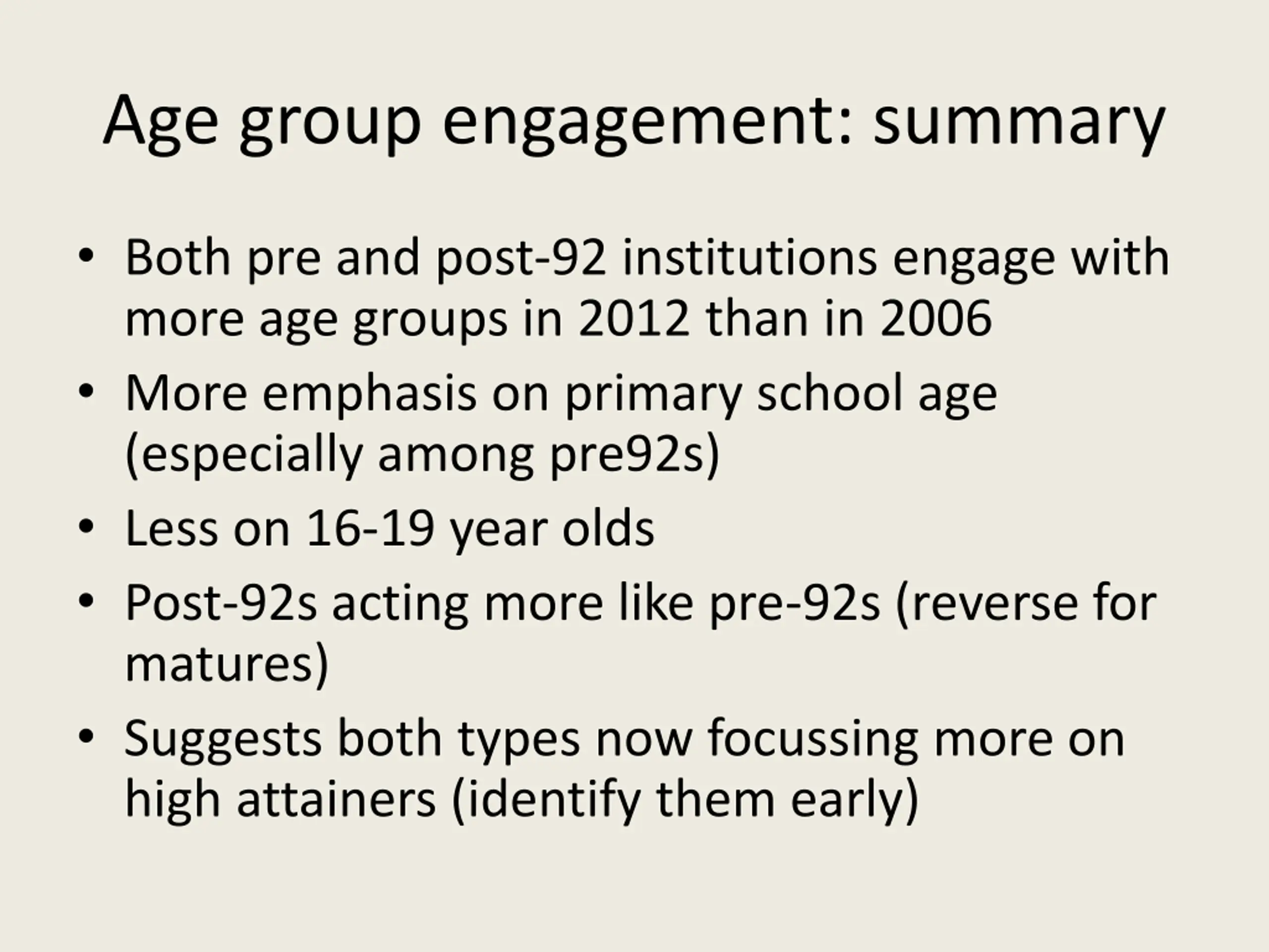 Age group engagement: summary Both pre and post-92 institutions engage with more age groups in 2012 than in 2006 More emphasis on primary school age (especially among pre92s) Less on 16-19 year olds Post-92s acting more like pre-92s (reverse for matures) Suggests both types now focussing more on high attainers (identify them early)
