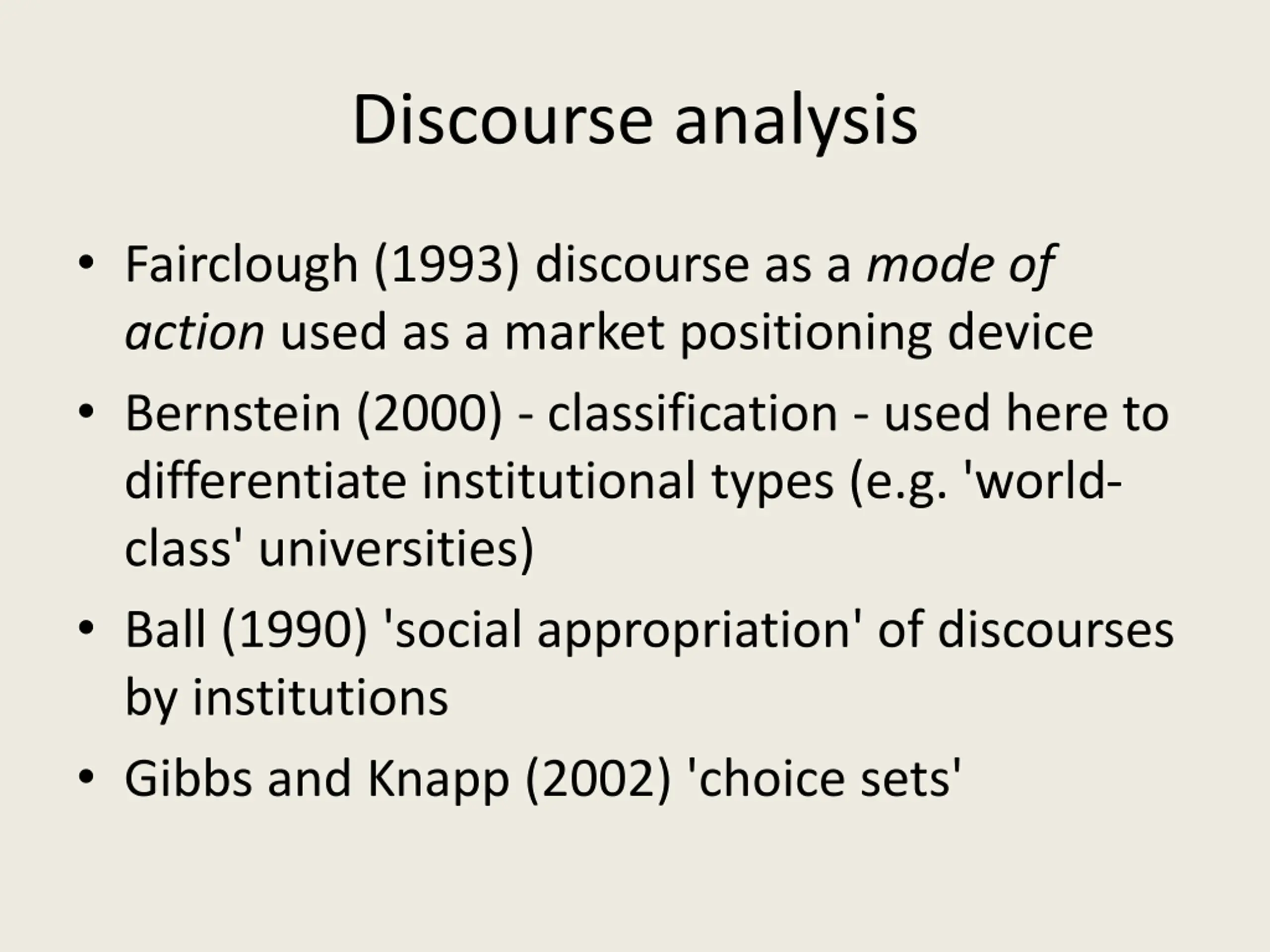 Discourse analysis Fairclough (1993) discourse as a mode of action used as a market positioning device Bernstein (2000) - classification - used here to differentiate institutional types (e.g. 'world- class' universities) Ball (1990) 'social appropriation' of discourses by institutions Gibbs and Knapp (2002) 'choice sets'