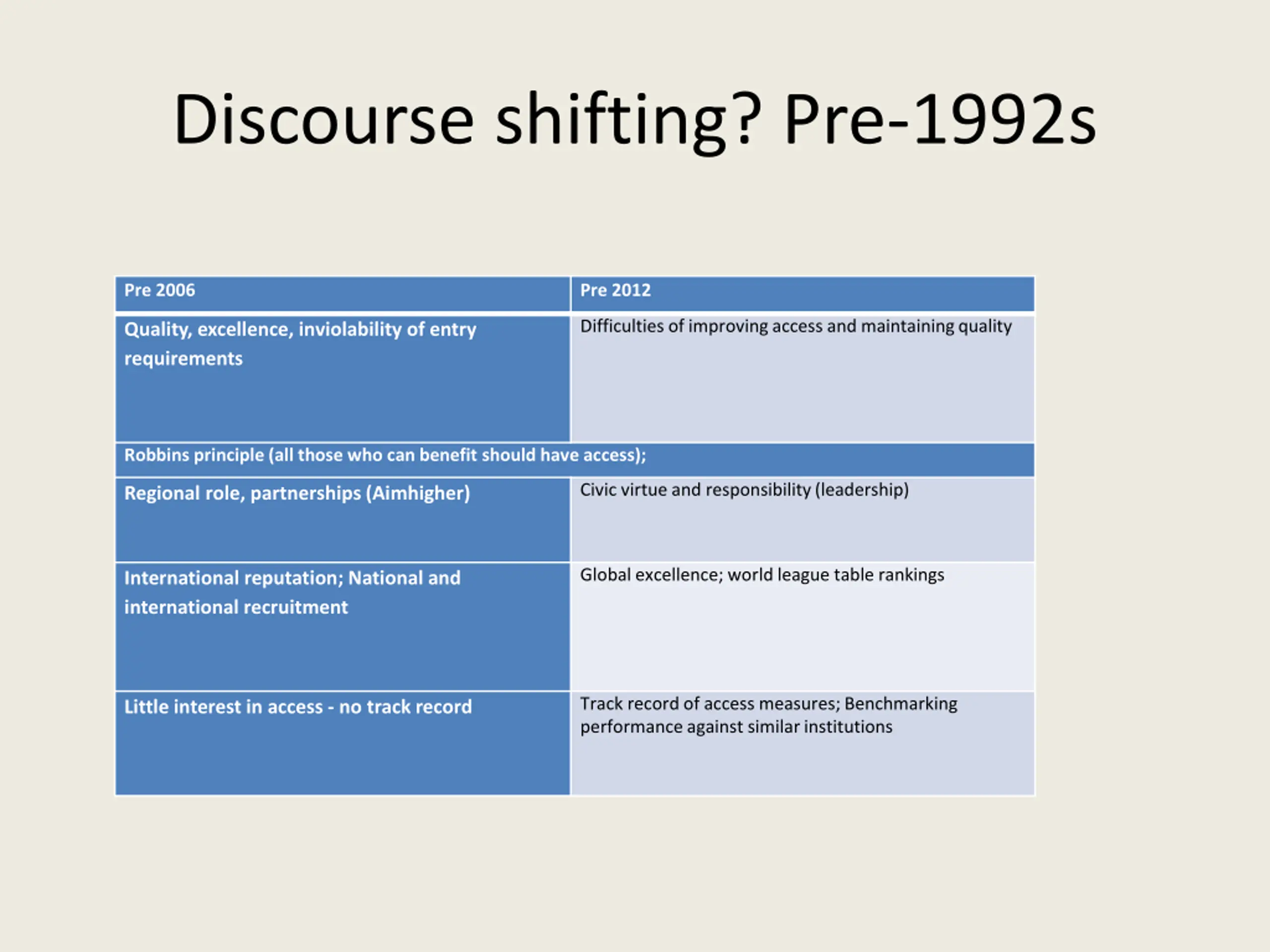 Discourse shifting? Pre-1992s Pre 2006 Pre 2012 Difficulties of improving access and maintaining quality Quality, excellence, inviolability of entry requirements Robbins principle (all those who can benefit should have access); Civic virtue and responsibility (leadership) Regional role, partnerships (Aimhigher) Global excellence; world league table rankings International reputation; National and international recruitment Track record of access measures; Benchmarking performance against similar institutions Little interest in access - no track record