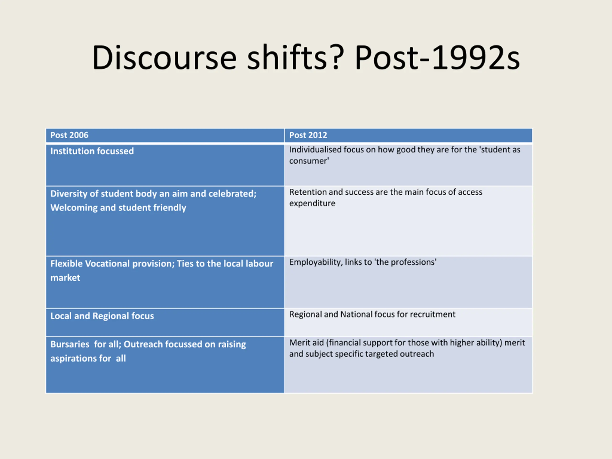 Discourse shifts? Post-1992s Post 2006 Post 2012 Individualised focus on how good they are for the 'student as consumer' Institution focussed Retention and success are the main focus of access expenditure Diversity of student body an aim and celebrated; Welcoming and student friendly Employability, links to 'the professions' Flexible Vocational provision; Ties to the local labour market Regional and National focus for recruitment Local and Regional focus Merit aid (financial support for those with higher ability) merit and subject specific targeted outreach Bursaries for all; Outreach focussed on raising aspirations for all