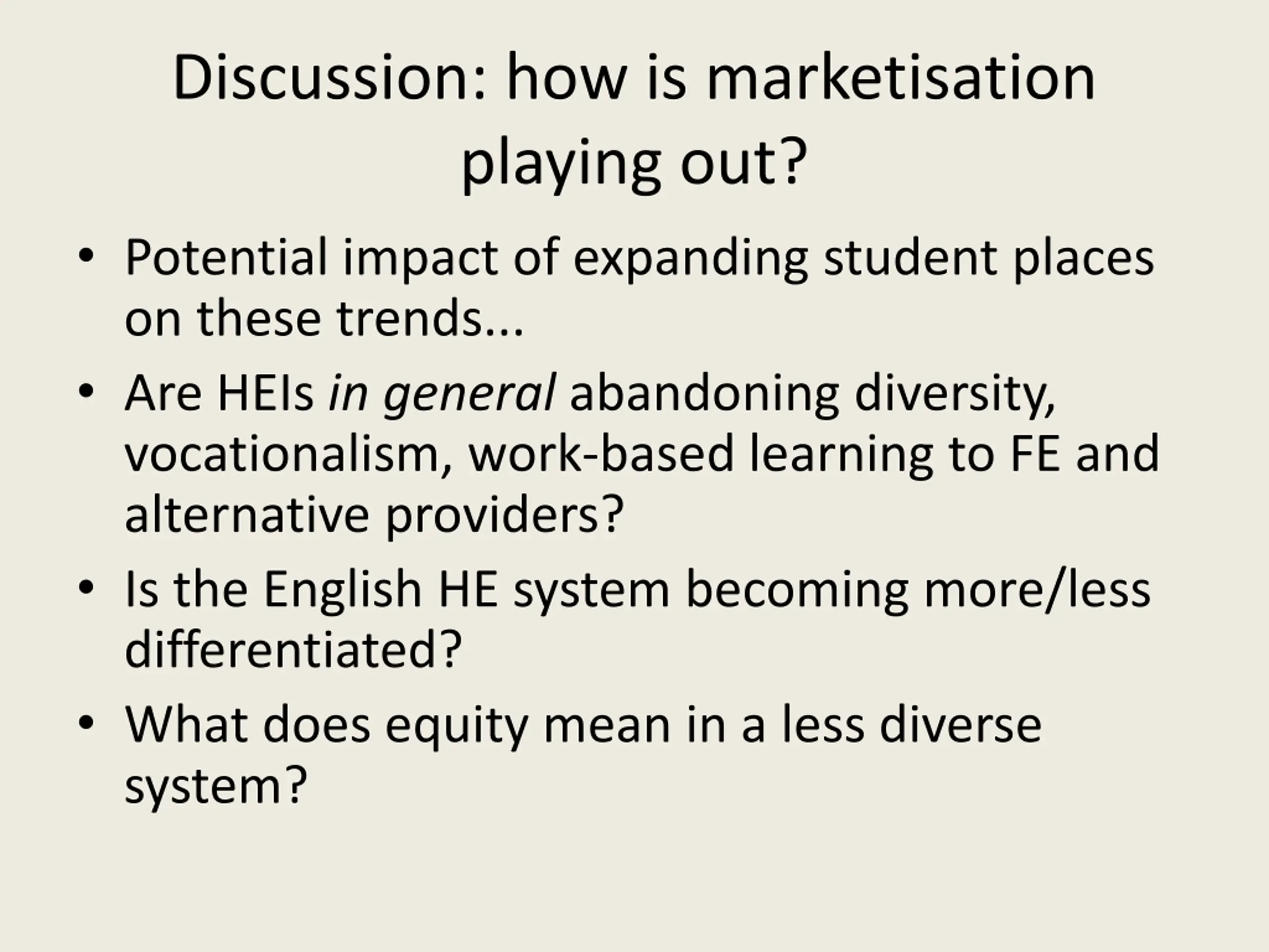 Discussion: how is marketisation playing out? Potential impact of expanding student places on these trends... Are HEIs in general abandoning diversity, vocationalism, work-based learning to FE and alternative providers? Is the English HE system becoming more/less differentiated? What does equity mean in a less diverse system?