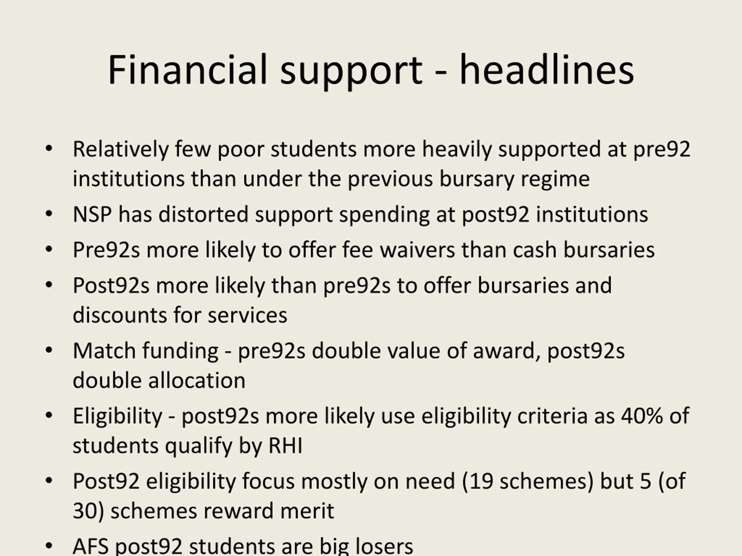 Financial support - headlines Relatively few poor students more heavily supported at pre92 institutions than under the previous bursary regime NSP has distorted support spending at post92 institutions Pre92s more likely to offer fee waivers than cash bursaries Post92s more likely than pre92s to offer bursaries and discounts for services Match funding - pre92s double value of award, post92s double allocation Eligibility - post92s more likely use eligibility criteria as 40% of students qualify by RHI Post92 eligibility focus mostly on need (19 schemes) but 5 (of 30) schemes reward merit AFS post92 students are big losers