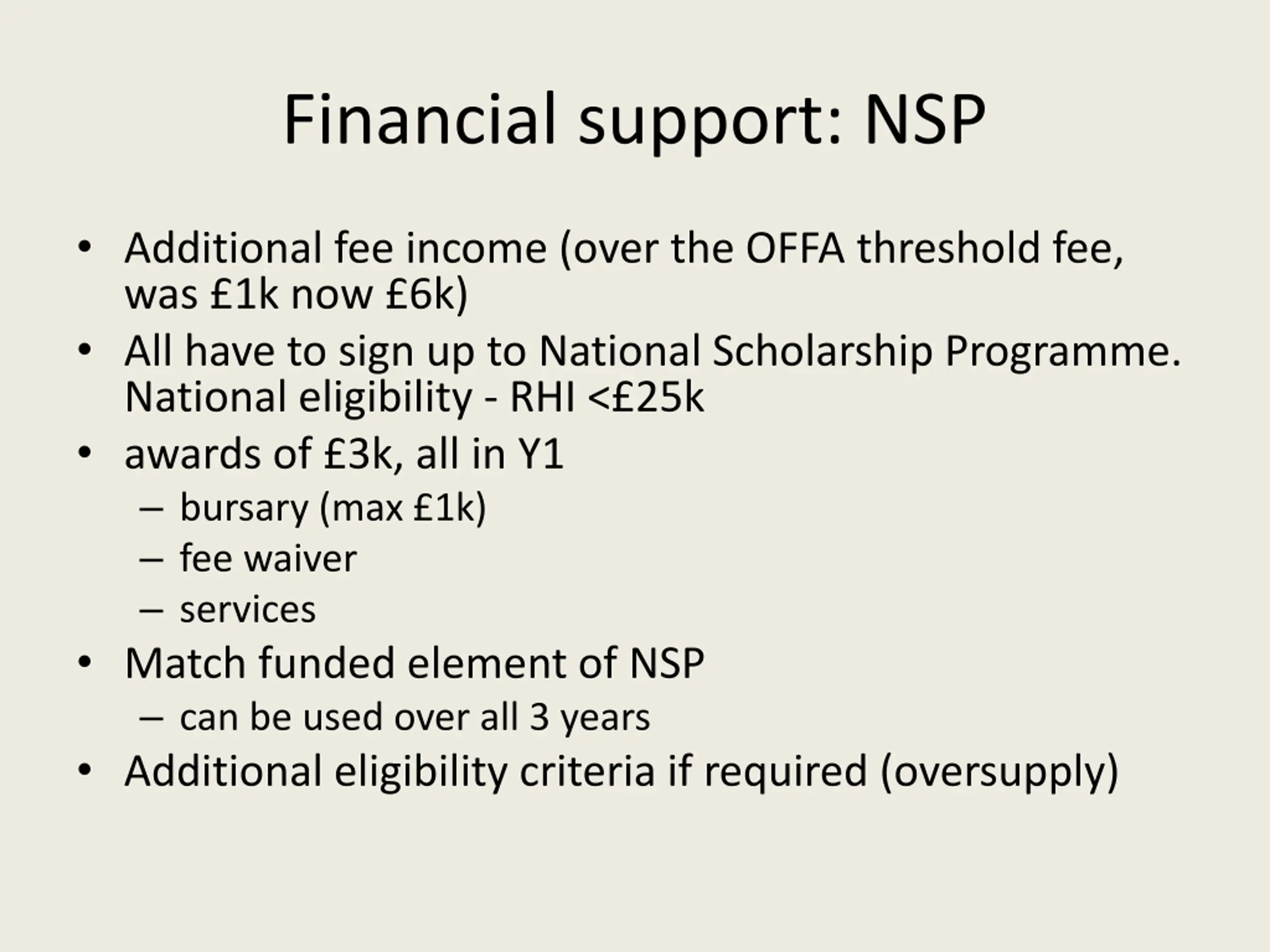 Financial support: NSP Additional fee income (over the OFFA threshold fee, was 1k now 6k) All have to sign up to National Scholarship Programme. National eligibility - RHI < 25k awards of 3k, all in Y1 bursary (max 1k) fee waiver services Match funded element of NSP can be used over all 3 years Additional eligibility criteria if required (oversupply)