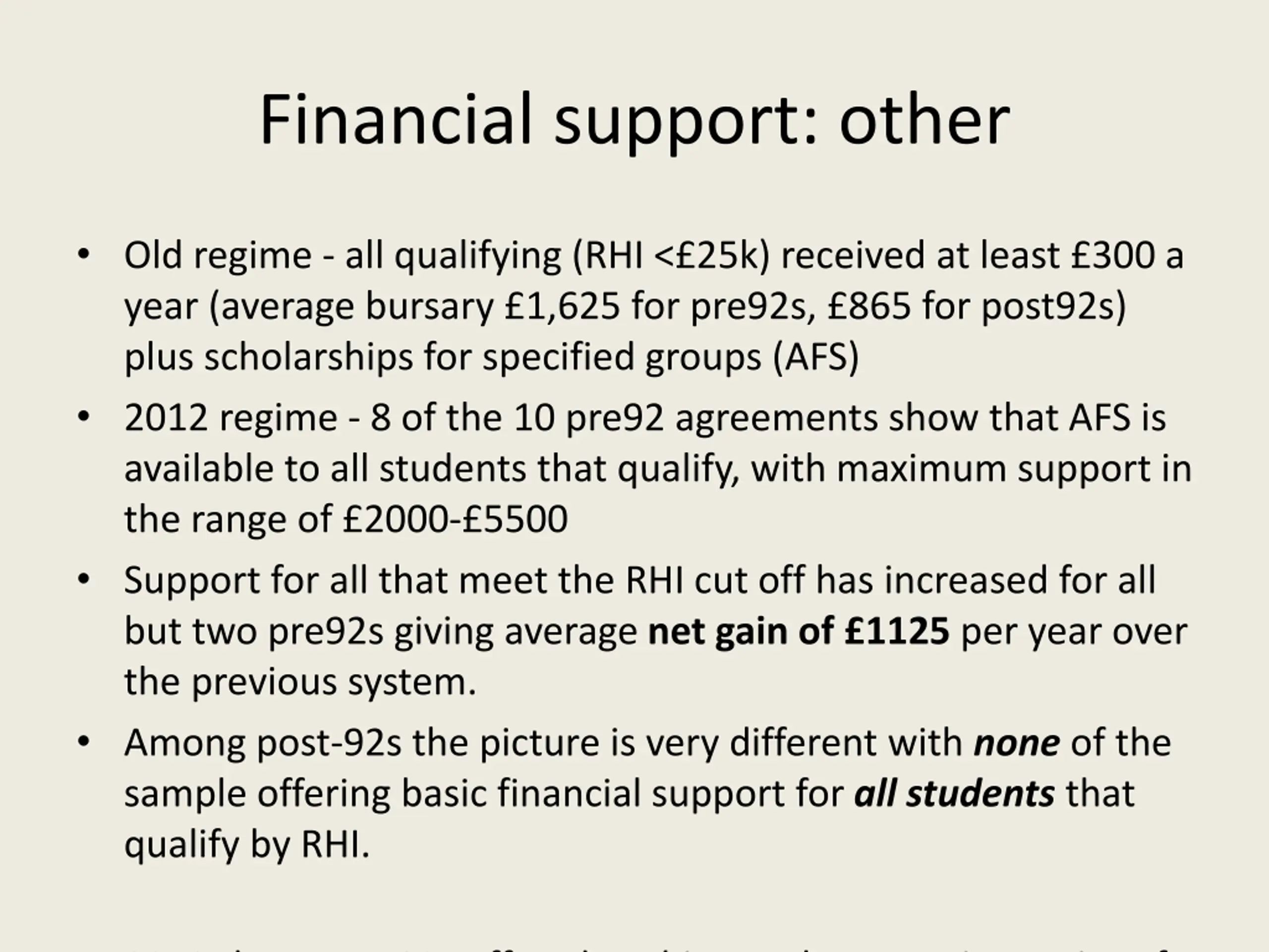 Financial support: other Old regime - all qualifying (RHI < 25k) received at least 300 a year (average bursary 1,625 for pre92s, 865 for post92s) plus scholarships for specified groups (AFS) 2012 regime - 8 of the 10 pre92 agreements show that AFS is available to all students that qualify, with maximum support in the range of 2000- 5500 Support for all that meet the RHI cut off has increased for all but two pre92s giving average net gain of 1125 per year over the previous system. Among post-92s the picture is very different with none of the sample offering basic financial support for all students that qualify by RHI. 2012 three post92s offered nothing to those not in receipt of