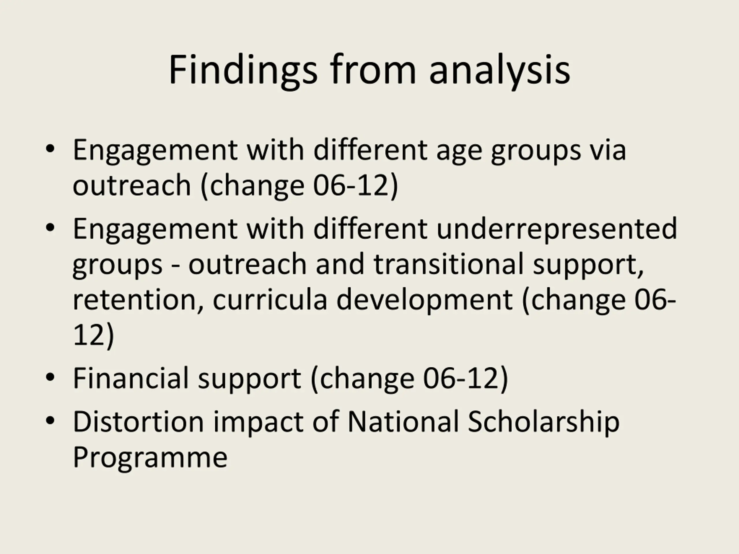 Findings from analysis Engagement with different age groups via outreach (change 06-12) Engagement with different underrepresented groups - outreach and transitional support, retention, curricula development (change 06- 12) Financial support (change 06-12) Distortion impact of National Scholarship Programme