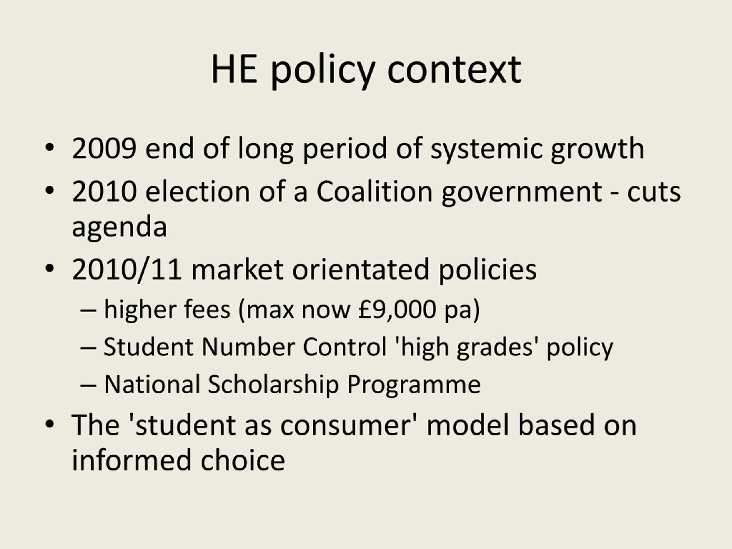 HE policy context 2009 end of long period of systemic growth 2010 election of a Coalition government - cuts agenda 2010/11 market orientated policies higher fees (max now 9,000 pa) Student Number Control 'high grades' policy National Scholarship Programme The 'student as consumer' model based on informed choice