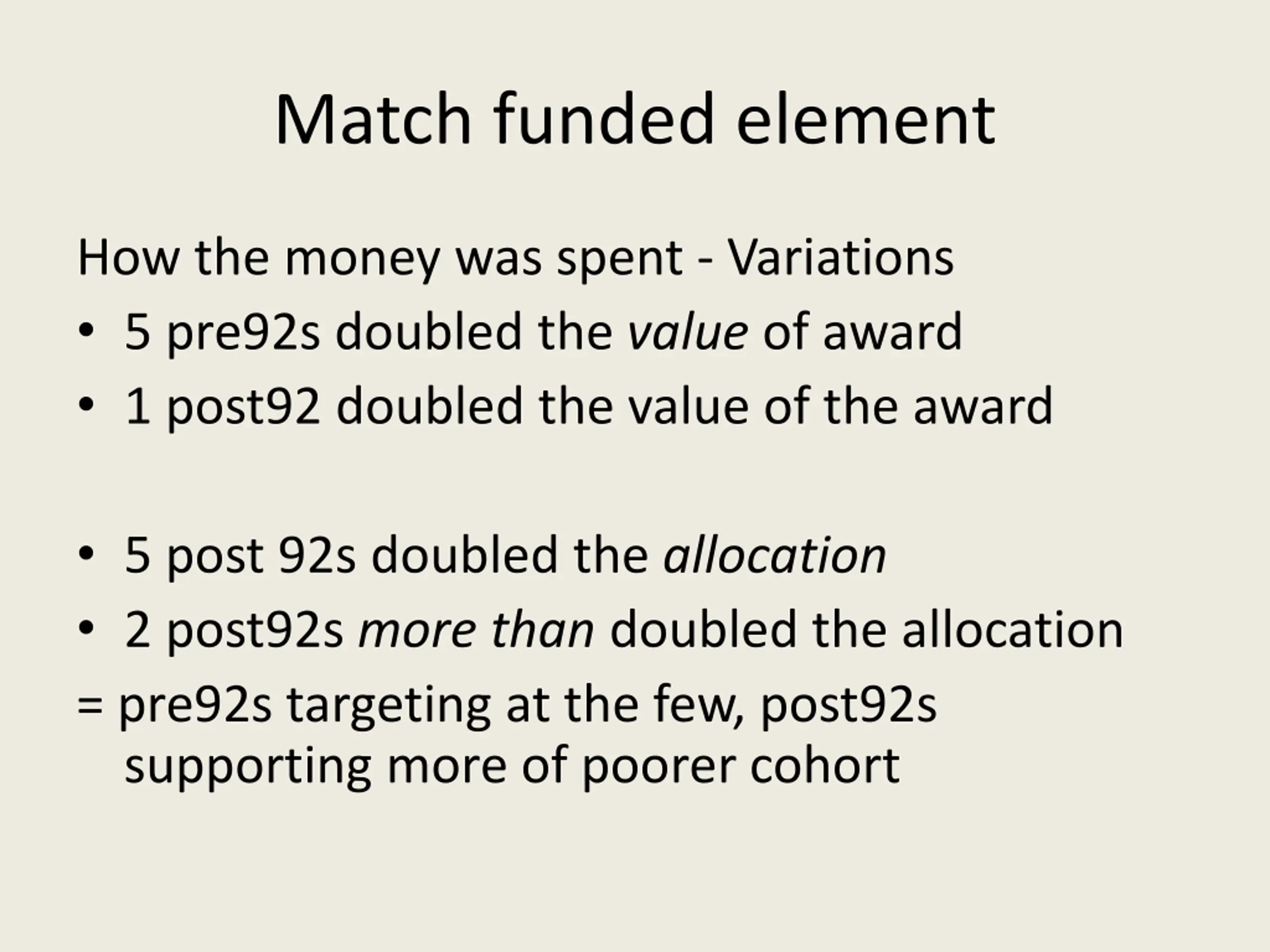 Match funded element How the money was spent - Variations 5 pre92s doubled the value of award 1 post92 doubled the value of the award 5 post 92s doubled the allocation 2 post92s more than doubled the allocation = pre92s targeting at the few, post92s supporting more of poorer cohort