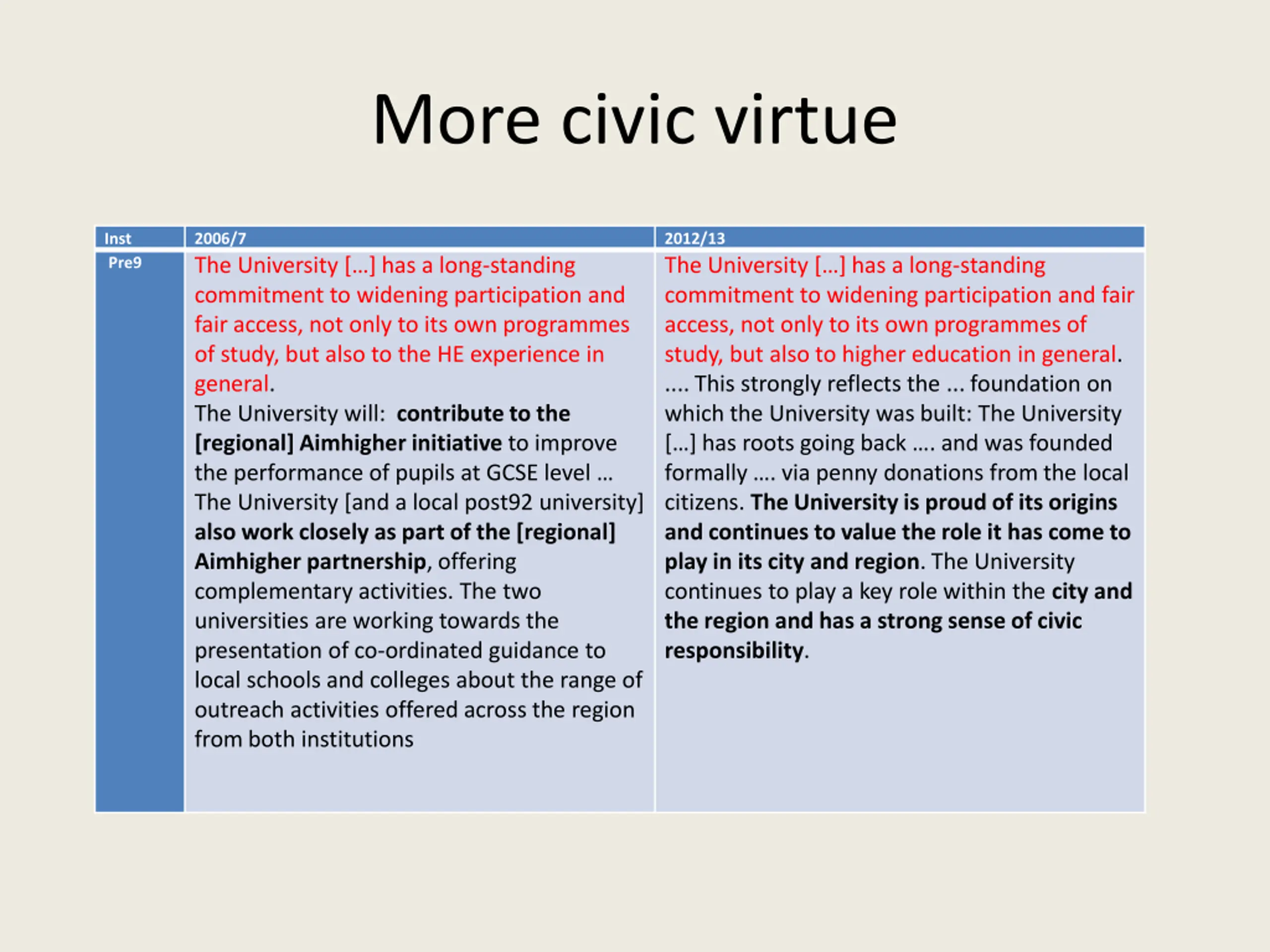 More civic virtue Inst Pre9 2006/7 The University [ ] has a long-standing commitment to widening participation and fair access, not only to its own programmes of study, but also to the HE experience in general. The University will: contribute to the [regional] Aimhigher initiative to improve the performance of pupils at GCSE level The University [and a local post92 university] also work closely as part of the [regional] Aimhigher partnership, offering complementary activities. The two universities are working towards the presentation of co-ordinated guidance to local schools and colleges about the range of outreach activities offered across the region from both institutions 2012/13 The University [ ] has a long-standing commitment to widening participation and fair access, not only to its own programmes of study, but also to higher education in general. .... This strongly reflects the ... foundation on which the University was built: The University [ ] has roots going back . and was founded formally . via penny donations from the local citizens. The University is proud of its origins and continues to value the role it has come to play in its city and region. The University continues to play a key role within the city and the region and has a strong sense of civic responsibility.