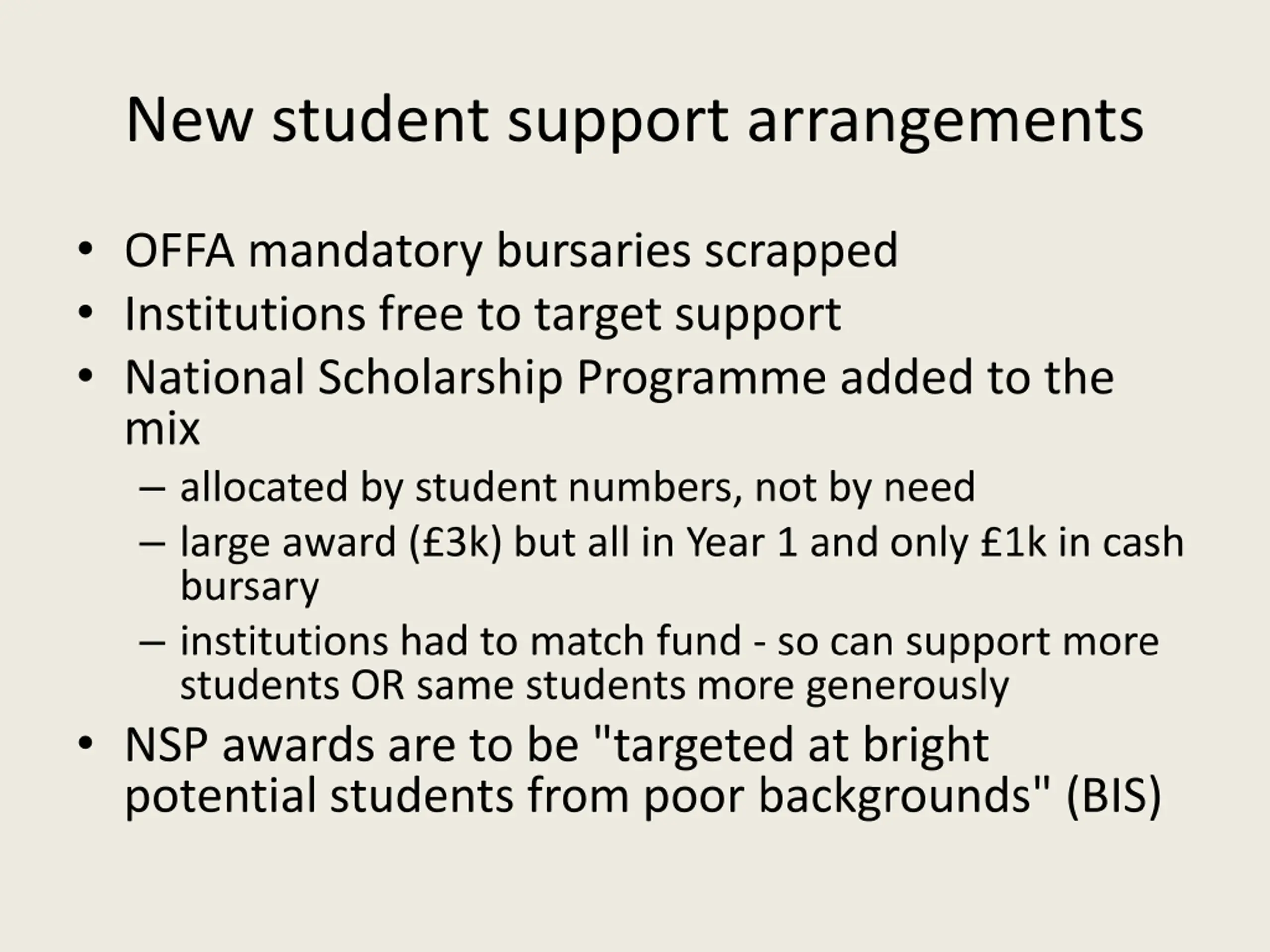 New student support arrangements OFFA mandatory bursaries scrapped Institutions free to target support National Scholarship Programme added to the mix allocated by student numbers, not by need large award ( 3k) but all in Year 1 and only 1k in cash bursary institutions had to match fund - so can support more students OR same students more generously NSP awards are to be "targeted at bright potential students from poor backgrounds" (BIS)
