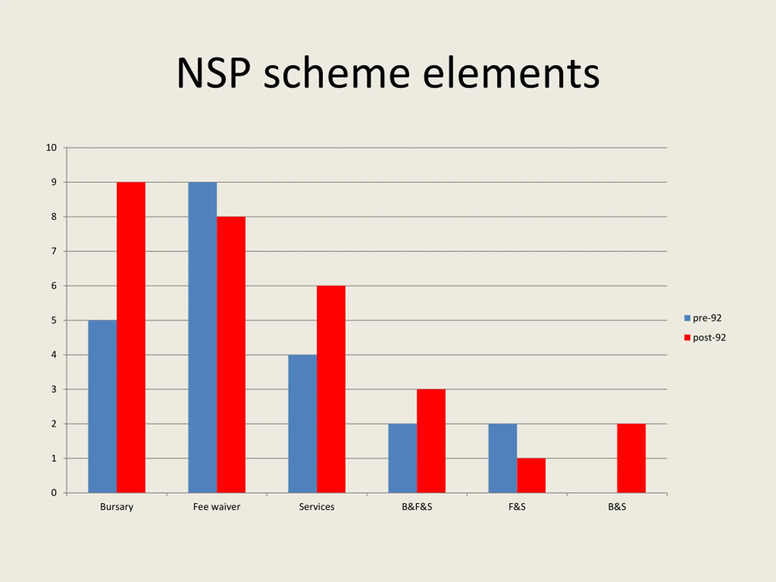 NSP scheme elements 10 9 8 7 6 pre-92 5 post-92 4 3 2 1 0 Bursary Fee waiver Services B&F&S F&S B&S