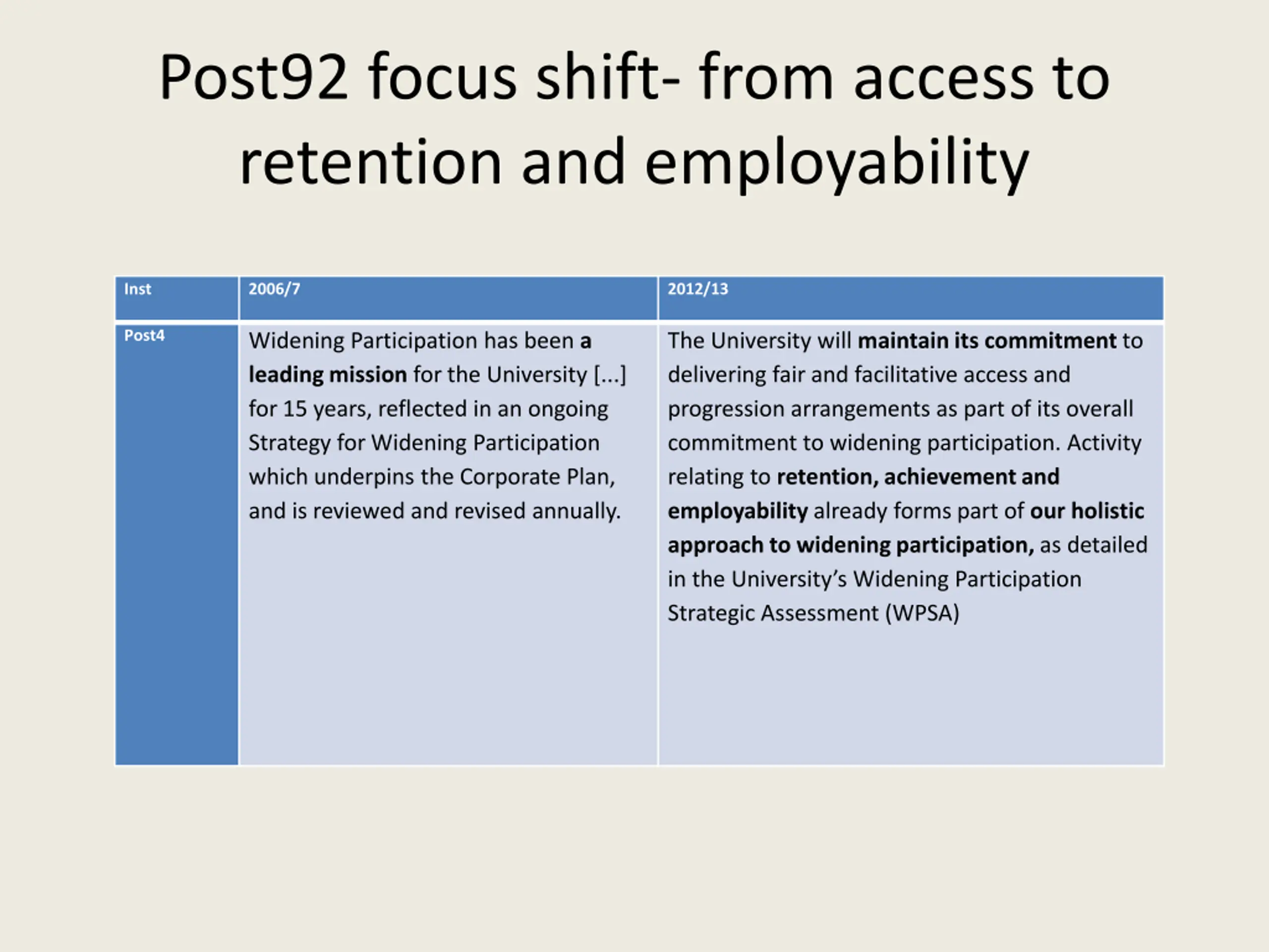 Post92 focus shift - from diversity to employability Inst 2006/7 2012/13 Post3 The University uses the term widening participation in its broadest sense and encompasses dimensions such as race, social class, age, gender, sexuality and disability. It also relates to the whole student experience of HE, ranging from pre-entry through to progression, achievement and employment. . The University has a diverse student population. One of its shared values is respect for diversity amongst members and prospective members of its community . We will ensure the accessibility of all our courses through a comprehensive programme of support that starts in local primary schools and extends to assisting our graduates into their chosen professional careers. . The University . has a long standing and well evidenced commitment to widening participation and fair access.
