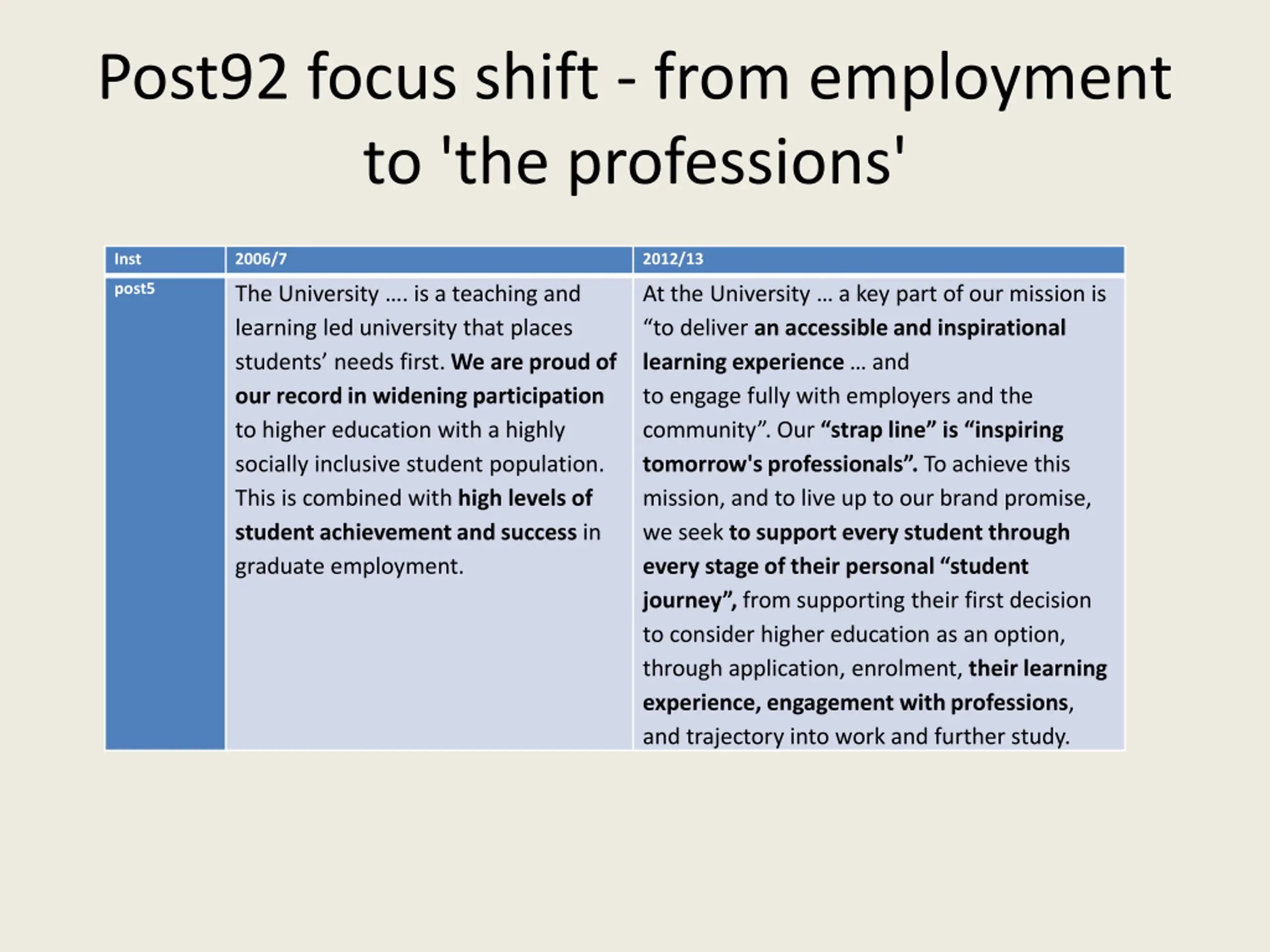 Post92 focus shift - from employment to 'the professions' Inst 2006/7 2012/13 post5 The University . is a teaching and learning led university that places students needs first. We are proud of our record in widening participation to higher education with a highly socially inclusive student population. This is combined with high levels of student achievement and success in graduate employment. At the University a key part of our mission is to deliver an accessible and inspirational learning experience and to engage fully with employers and the community . Our strap line is inspiring tomorrow's professionals . To achieve this mission, and to live up to our brand promise, we seek to support every student through every stage of their personal student journey , from supporting their first decision to consider higher education as an option, through application, enrolment, their learning experience, engagement with professions, and trajectory into work and further study.