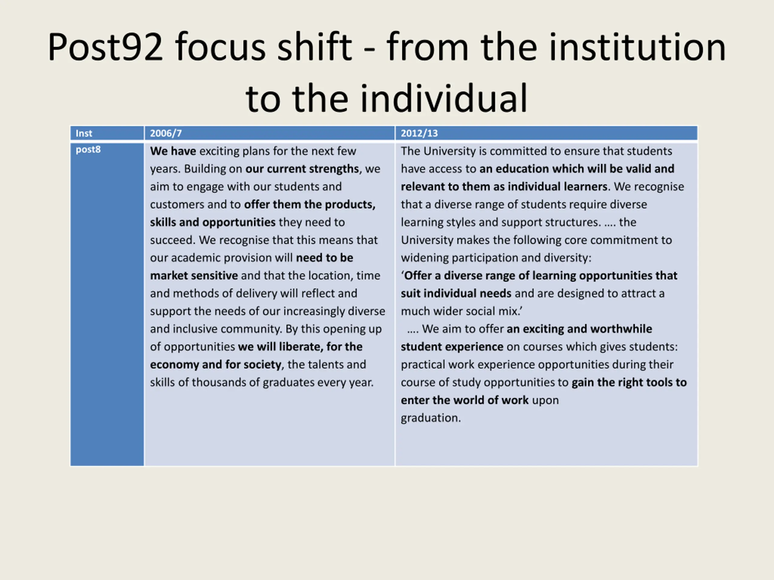 Post92 focus shift - from the institution to the individual Inst post8 2006/7 We have exciting plans for the next few years. Building on our current strengths, we aim to engage with our students and customers and to offer them the products, skills and opportunities they need to succeed. We recognise that this means that our academic provision will need to be market sensitive and that the location, time and methods of delivery will reflect and support the needs of our increasingly diverse and inclusive community. By this opening up of opportunities we will liberate, for the economy and for society, the talents and skills of thousands of graduates every year. 2012/13 The University is committed to ensure that students have access to an education which will be valid and relevant to them as individual learners. We recognise that a diverse range of students require diverse learning styles and support structures. . the University makes the following core commitment to widening participation and diversity: Offer a diverse range of learning opportunities that suit individual needs and are designed to attract a much wider social mix. . We aim to offer an exciting and worthwhile student experience on courses which gives students: practical work experience opportunities during their course of study opportunities to gain the right tools to enter the world of work upon graduation.