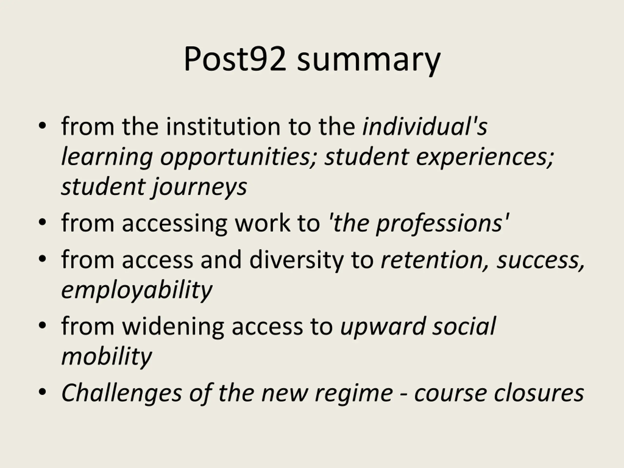 Post92 summary from the institution to the individual's learning opportunities; student experiences; student journeys from accessing work to 'the professions' from access and diversity to retention, success, employability from widening access to upward social mobility Challenges of the new regime - course closures