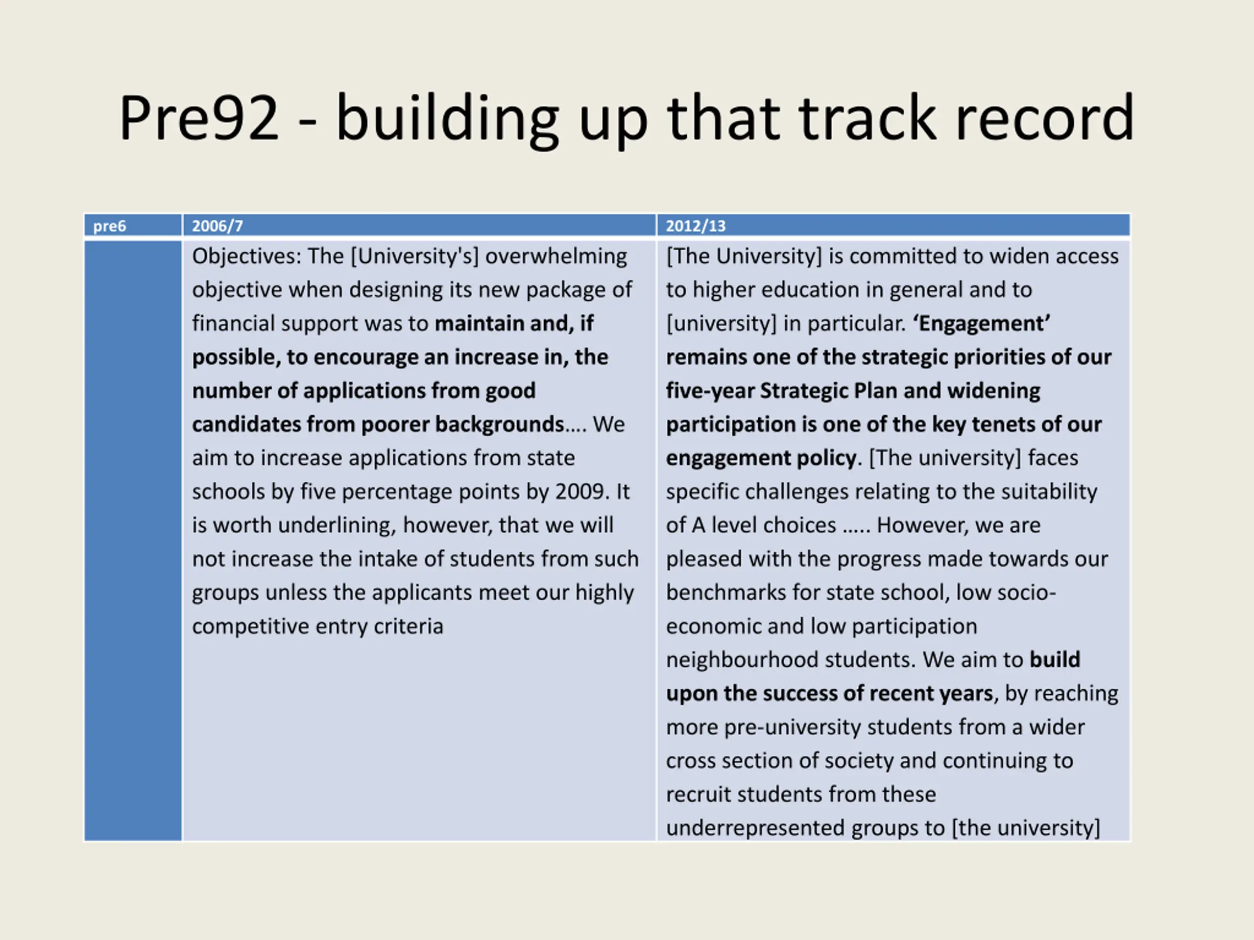 Pre92 - building up that track record pre6 2006/7 Objectives: The [University's] overwhelming objective when designing its new package of financial support was to maintain and, if possible, to encourage an increase in, the number of applications from good candidates from poorer backgrounds . We aim to increase applications from state schools by five percentage points by 2009. It is worth underlining, however, that we will not increase the intake of students from such groups unless the applicants meet our highly competitive entry criteria 2012/13 [The University] is committed to widen access to higher education in general and to [university] in particular. Engagement remains one of the strategic priorities of our five-year Strategic Plan and widening participation is one of the key tenets of our engagement policy. [The university] faces specific challenges relating to the suitability of A level choices .. However, we are pleased with the progress made towards our benchmarks for state school, low socio- economic and low participation neighbourhood students. We aim to build upon the success of recent years, by reaching more pre-university students from a wider cross section of society and continuing to recruit students from these underrepresented groups to [the university]