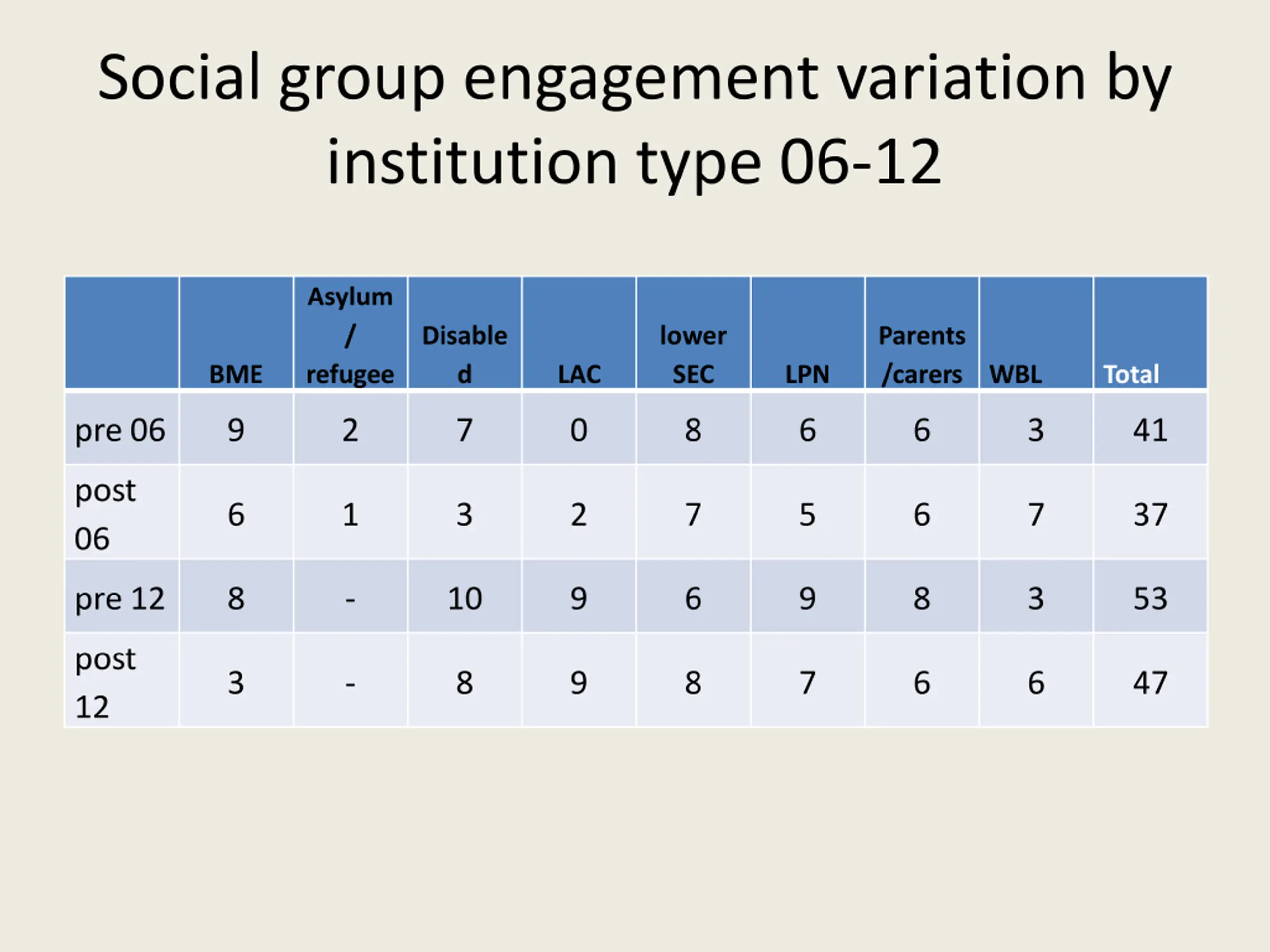 Social group engagement variation by institution type 06-12 Asylum / refugee Disable d lower SEC Parents /carers BME LAC LPN WBL Total pre 06 9 2 7 0 8 6 6 3 41 post 06 6 1 3 2 7 5 6 7 37 pre 12 8 - 10 9 6 9 8 3 53 post 12 3 - 8 9 8 7 6 6 47