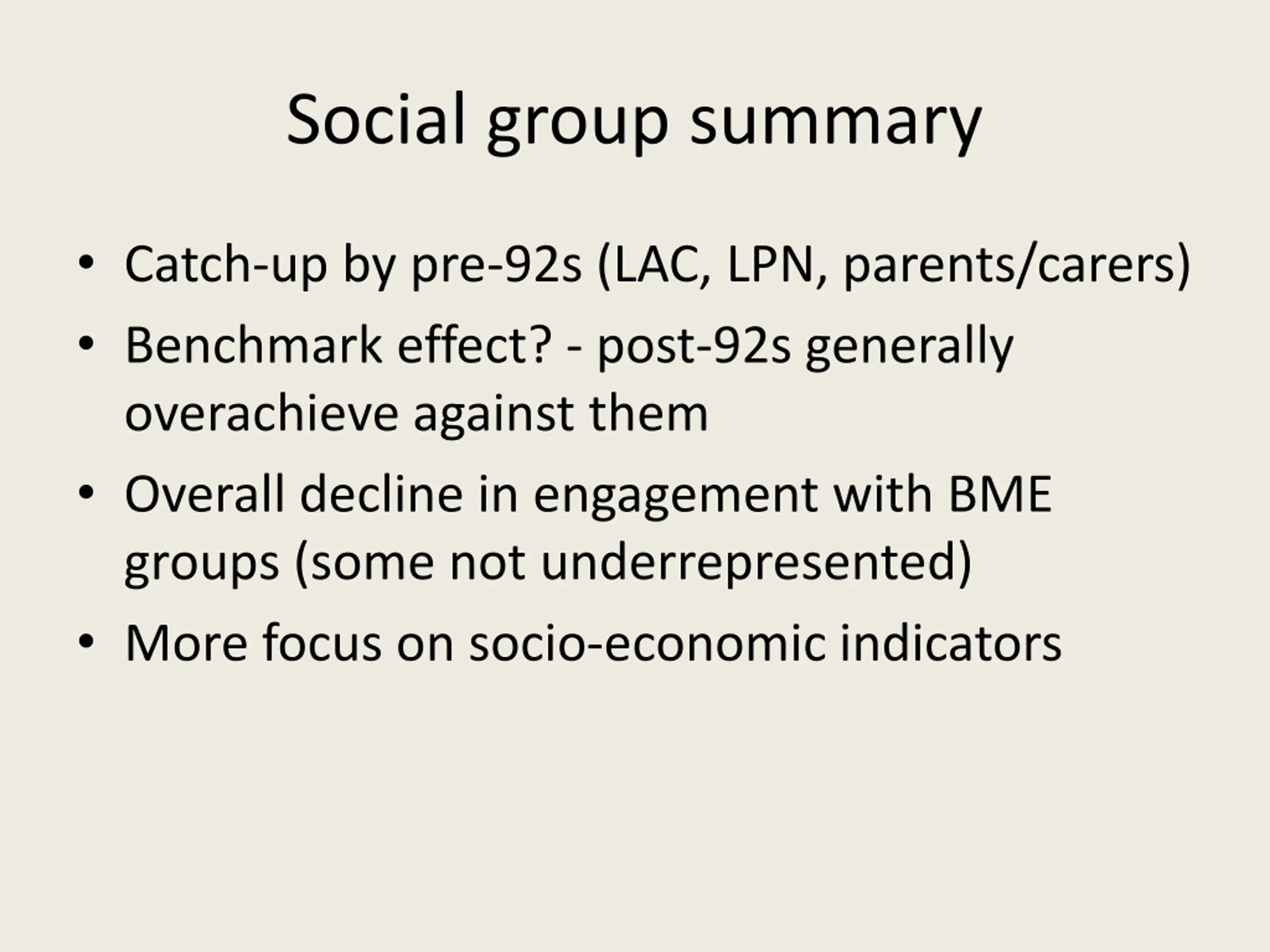 Social group summary Catch-up by pre-92s (LAC, LPN, parents/carers) Benchmark effect? - post-92s generally overachieve against them Overall decline in engagement with BME groups (some not underrepresented) More focus on socio-economic indicators