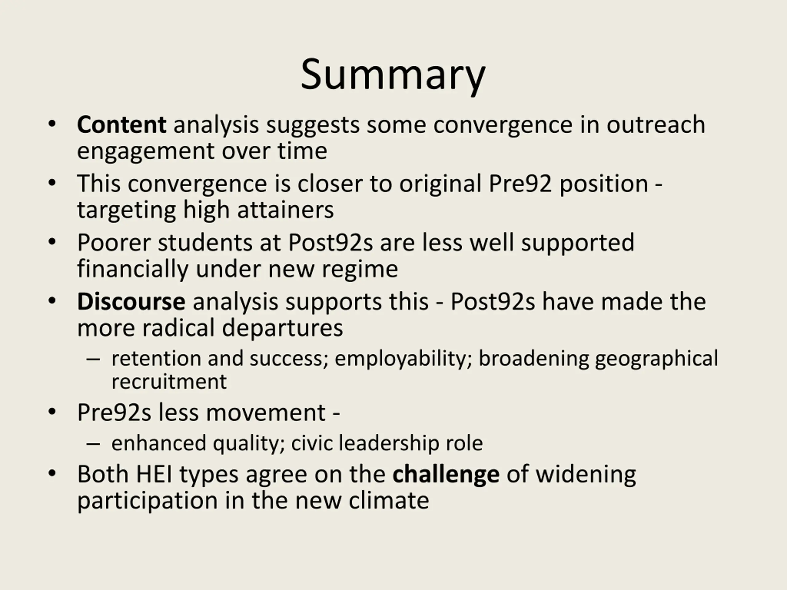 Summary Content analysis suggests some convergence in outreach engagement over time This convergence is closer to original Pre92 position - targeting high attainers Poorer students at Post92s are less well supported financially under new regime Discourse analysis supports this - Post92s have made the more radical departures retention and success; employability; broadening geographical recruitment Pre92s less movement - enhanced quality; civic leadership role Both HEI types agree on the challenge of widening participation in the new climate