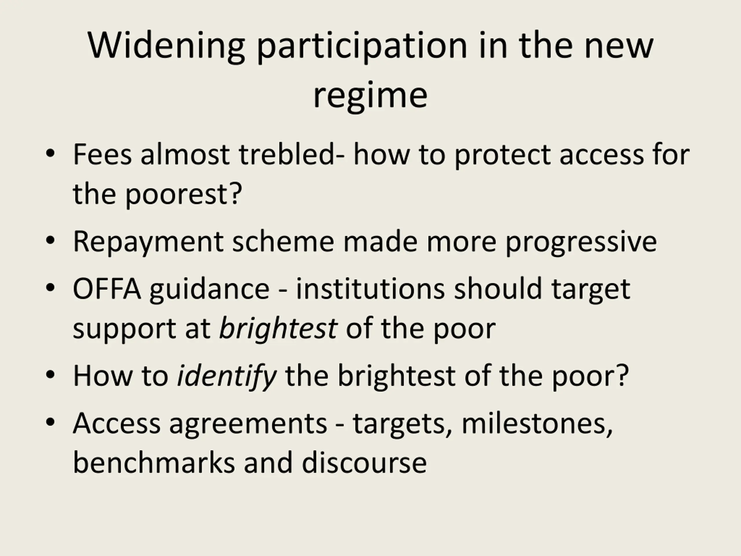 Widening participation in the new regime Fees almost trebled- how to protect access for the poorest? Repayment scheme made more progressive OFFA guidance - institutions should target support at brightest of the poor How to identify the brightest of the poor? Access agreements - targets, milestones, benchmarks and discourse