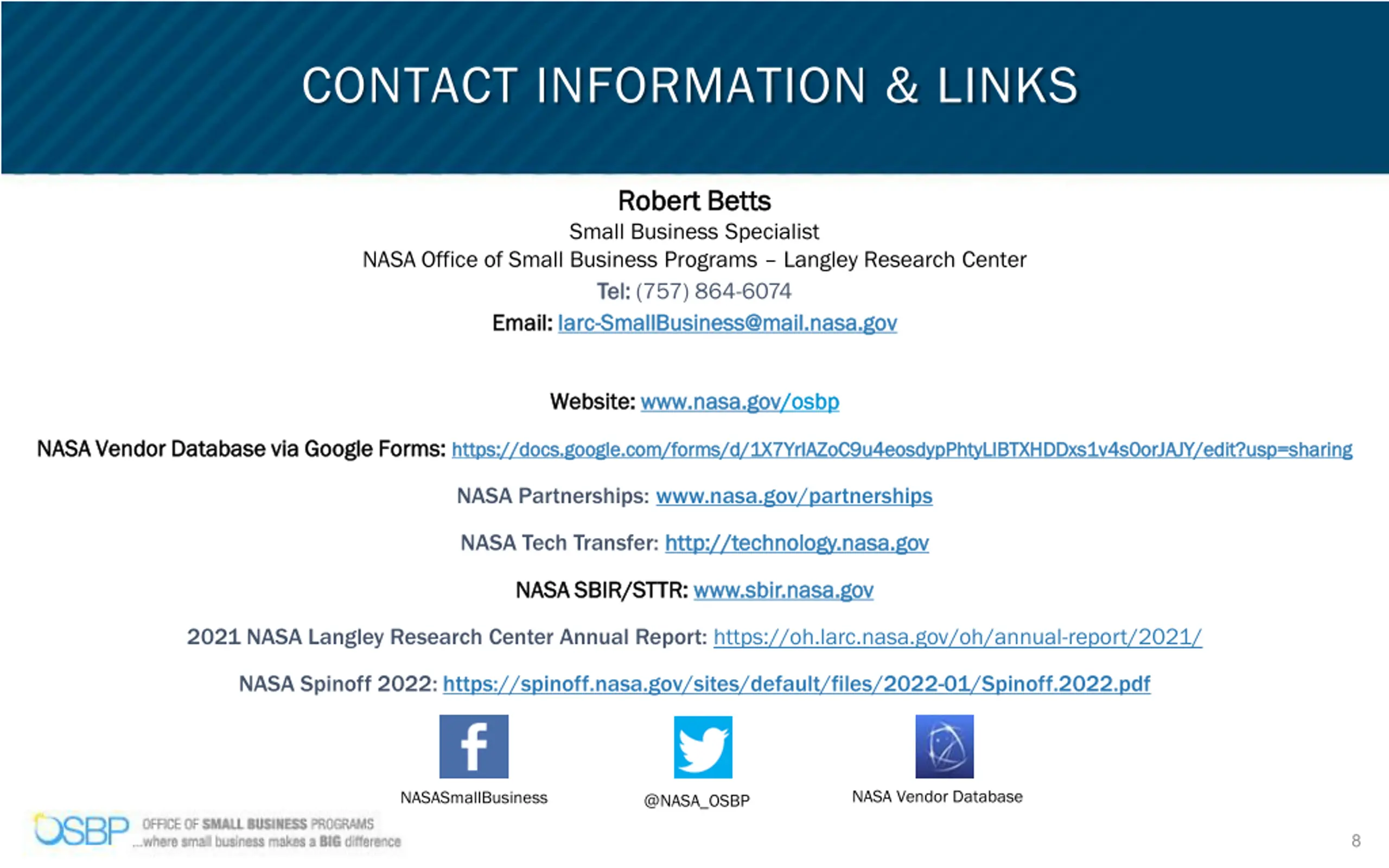 CONTACT INFORMATION & LINKS Robert Betts Robert Betts Small Business Specialist NASA Office of Small Business Programs Langley Research Center Tel: Tel: (757) 864-6074 Email: Email: larc larc- -S SmallBusiness@mail.nasa.gov mallBusiness@mail.nasa.gov Website: Website: www.nasa.gov www.nasa.gov/osbp /osbp NASA Vendor Database via Google Forms: NASA Vendor Database via Google Forms: https://docs.google.com/forms/d/1X7YrIAZoC9u4eosdypPhtyLlBTXHDDxs1v4s0orJAJY/edit?usp=sharing https://docs.google.com/forms/d/1X7YrIAZoC9u4eosdypPhtyLlBTXHDDxs1v4s0orJAJY/edit?usp=sharing NASA Partnerships: www.nasa.gov/partnerships NASA Tech Transfer: http://technology.nasa.gov http://technology.nasa.gov NASA SBIR/STTR: NASA SBIR/STTR: www.sbir.nasa.gov www.sbir.nasa.gov 2021 NASA Langley Research Center Annual Report: https://oh.larc.nasa.gov/oh/annual-report/2021/ NASA Spinoff 2022: https://spinoff.nasa.gov/sites/default/files/2022-01/Spinoff.2022.pdf Facebook icon NASA Vendor Database icon Twitter icon NASA Vendor Database NASASmallBusiness @NASA_OSBP 8