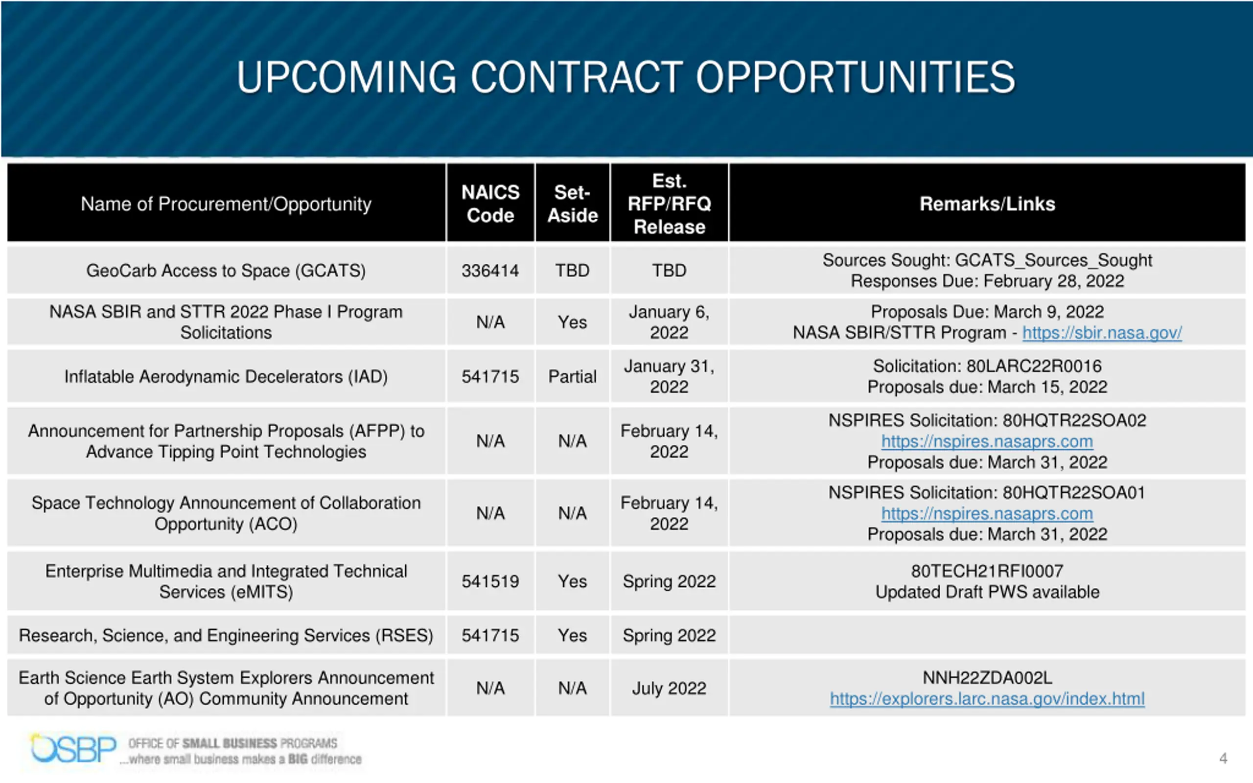 NASA Small Business Programs Update and Contract Opportunities FY22