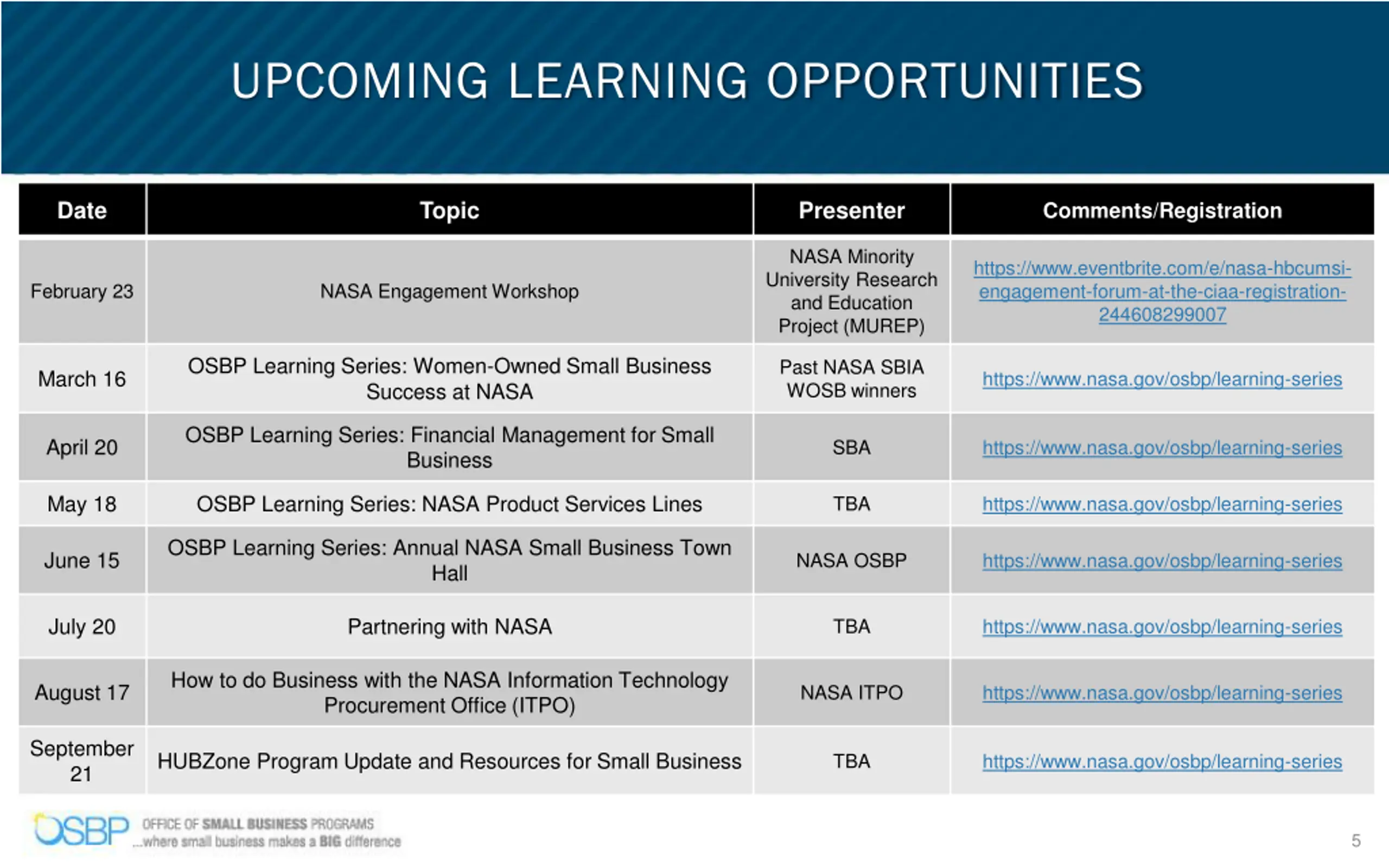UPCOMING LEARNING OPPORTUNITIES Date Topic Presenter Comments/Registration NASA Minority University Research and Education Project (MUREP) https://www.eventbrite.com/e/nasa-hbcumsi- engagement-forum-at-the-ciaa-registration- 244608299007 February 23 NASA Engagement Workshop OSBP Learning Series: Women-Owned Small Business Success at NASA Past NASA SBIA WOSB winners March 16 https://www.nasa.gov/osbp/learning-series OSBP Learning Series: Financial Management for Small Business April 20 SBA https://www.nasa.gov/osbp/learning-series May 18 OSBP Learning Series: NASA Product Services Lines TBA https://www.nasa.gov/osbp/learning-series OSBP Learning Series: Annual NASA Small Business Town Hall June 15 NASA OSBP https://www.nasa.gov/osbp/learning-series July 20 Partnering with NASA TBA https://www.nasa.gov/osbp/learning-series How to do Business with the NASA Information Technology Procurement Office (ITPO) August 17 NASA ITPO https://www.nasa.gov/osbp/learning-series September 21 HUBZone Program Update and Resources for Small Business TBA https://www.nasa.gov/osbp/learning-series 5