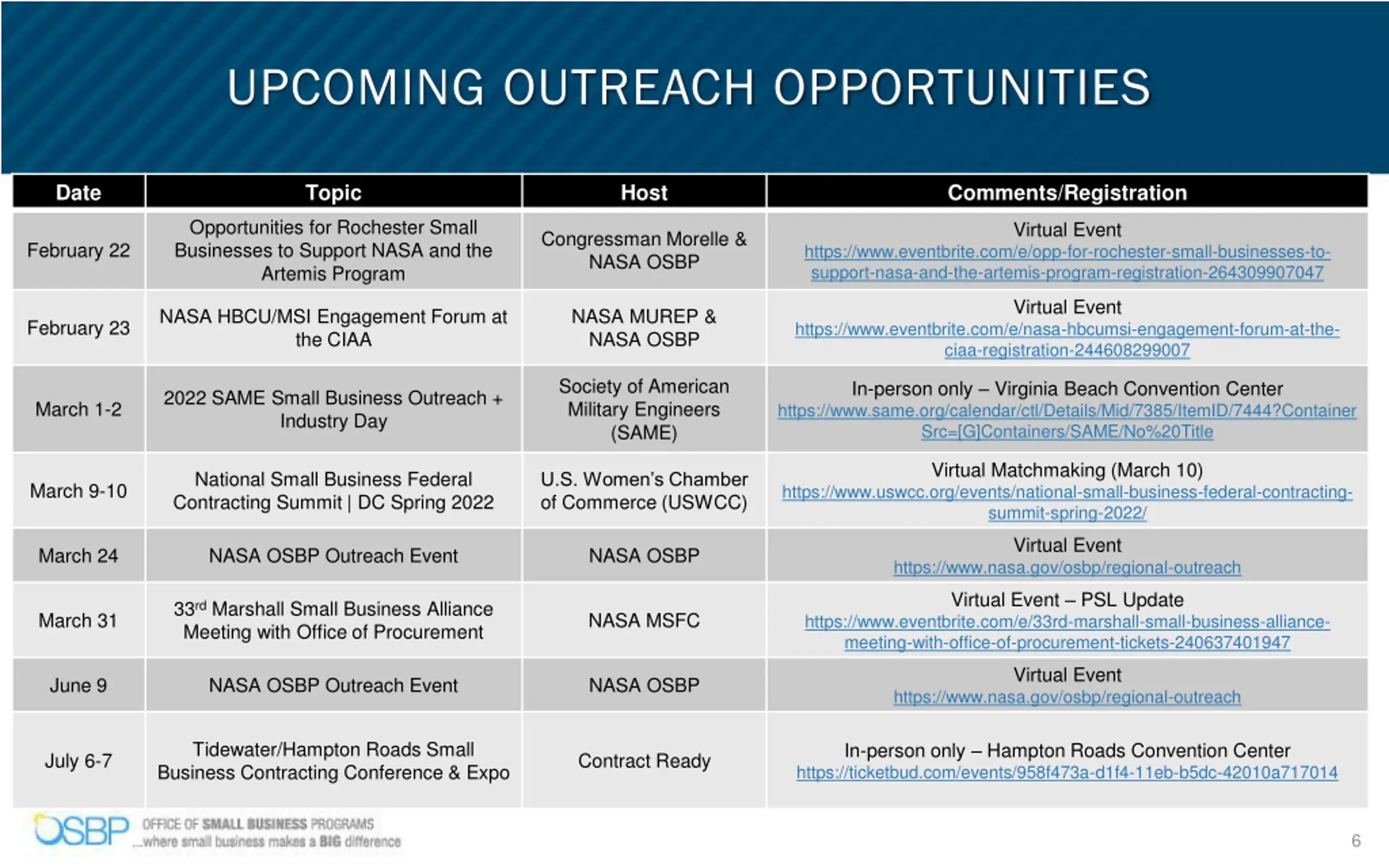 UPCOMING OUTREACH OPPORTUNITIES Date Topic Host Comments/Registration Opportunities for Rochester Small Businesses to Support NASA and the Artemis Program Virtual Event Congressman Morelle & NASA OSBP February 22 https://www.eventbrite.com/e/opp-for-rochester-small-businesses-to- support-nasa-and-the-artemis-program-registration-264309907047 Virtual Event NASA HBCU/MSI Engagement Forum at the CIAA NASA MUREP & NASA OSBP February 23 https://www.eventbrite.com/e/nasa-hbcumsi-engagement-forum-at-the- ciaa-registration-244608299007 Society of American Military Engineers (SAME) In-person only Virginia Beach Convention Center https://www.same.org/calendar/ctl/Details/Mid/7385/ItemID/7444?Container Src=[G]Containers/SAME/No%20Title 2022 SAME Small Business Outreach + Industry Day March 1-2 Virtual Matchmaking (March 10) National Small Business Federal Contracting Summit | DC Spring 2022 U.S. Women s Chamber of Commerce (USWCC) March 9-10 https://www.uswcc.org/events/national-small-business-federal-contracting- summit-spring-2022/ Virtual Event March 24 NASA OSBP Outreach Event NASA OSBP https://www.nasa.gov/osbp/regional-outreach Virtual Event PSL Update 33rd Marshall Small Business Alliance Meeting with Office of Procurement March 31 NASA MSFC https://www.eventbrite.com/e/33rd-marshall-small-business-alliance- meeting-with-office-of-procurement-tickets-240637401947 Virtual Event June 9 NASA OSBP Outreach Event NASA OSBP https://www.nasa.gov/osbp/regional-outreach Tidewater/Hampton Roads Small Business Contracting Conference & Expo In-person only Hampton Roads Convention Center https://ticketbud.com/events/958f473a-d1f4-11eb-b5dc-42010a717014 July 6-7 Contract Ready 6